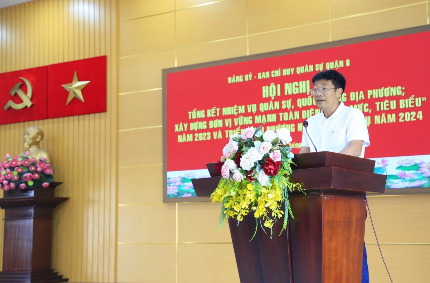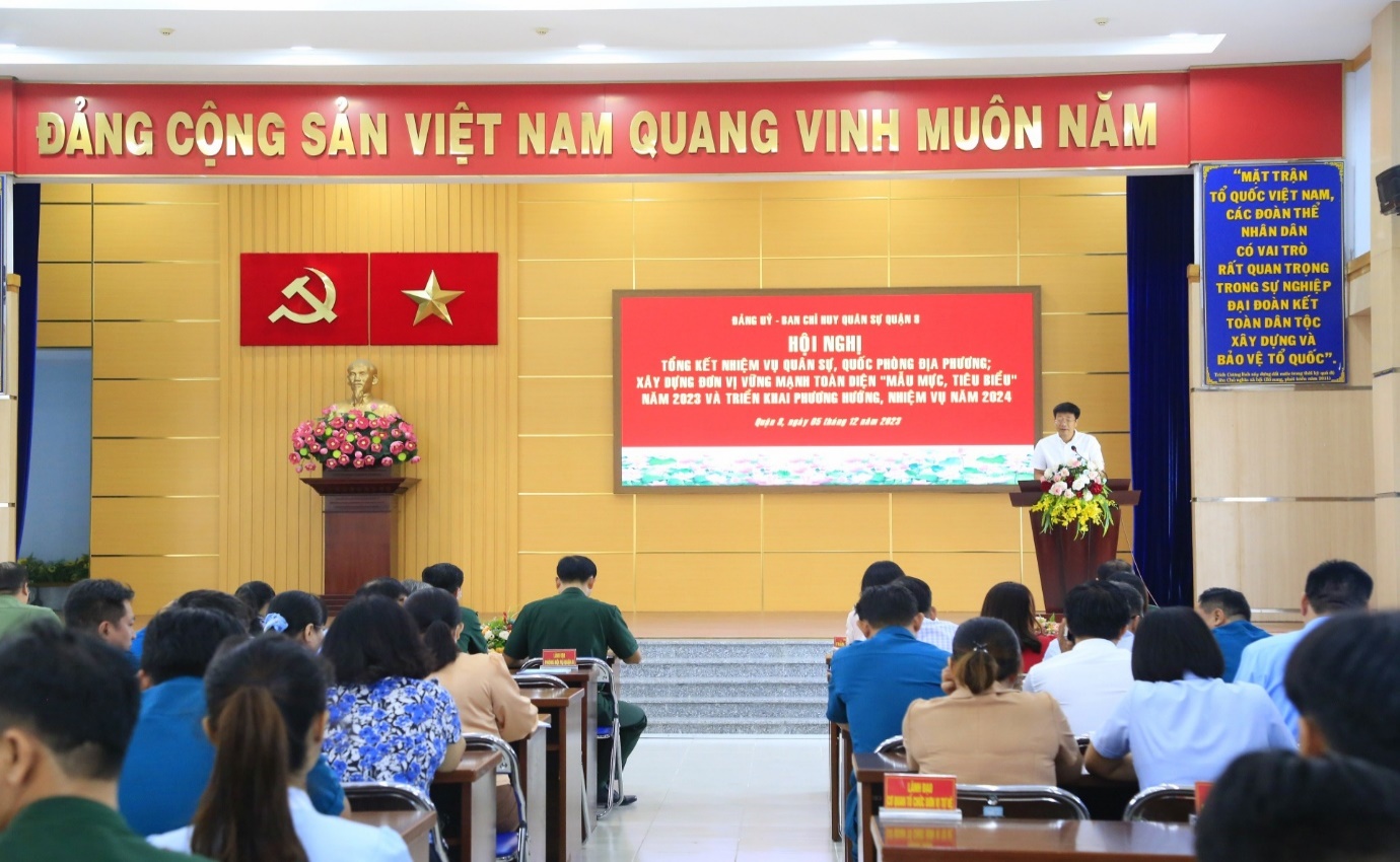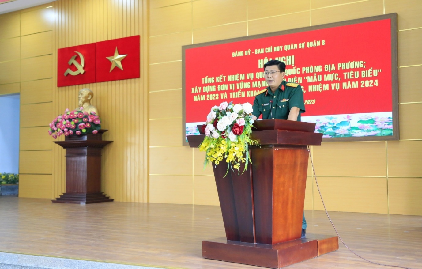(QK7 Online) - Ngày 5/12, Ban Chỉ huy Quân sự (CHQS) Quận 8, Bộ Tư lệnh TPHCM tổ chức Hội nghị tổng kết nhiệm vụ quân sự, quốc phòng địa phương, xây dựng đơn vị vững mạnh toàn diện "Mẫu mực, tiêu biểu" năm 2023 và triển khai phương hướng, nhiệm vụ năm 2024.Đến dự có Thượng tá Nguyễn Văn Hậu, Phó Tham mưu trưởng Bộ Tư lệnh Thành phố; đồng chí Trần Thanh Tùng, Phó Bí thư Quận ủy, Chủ tịch UBND Quận 8.