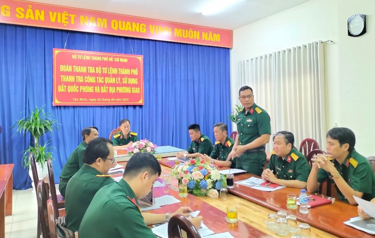 (QK7 Online) - Ngày 2/8, đoàn công tác của Bộ Tư lệnh TPHCM do Thượng tá Nguyễn Anh Tú, Chánh Thanh tra Quốc phòng làm trưởng đoàn kiểm tra công tác quản lý, sử dụng đất quốc phòng và đất địa phương giao đối với Ban Chỉ huy Quân sự (CHQS) quận Tân Bình.