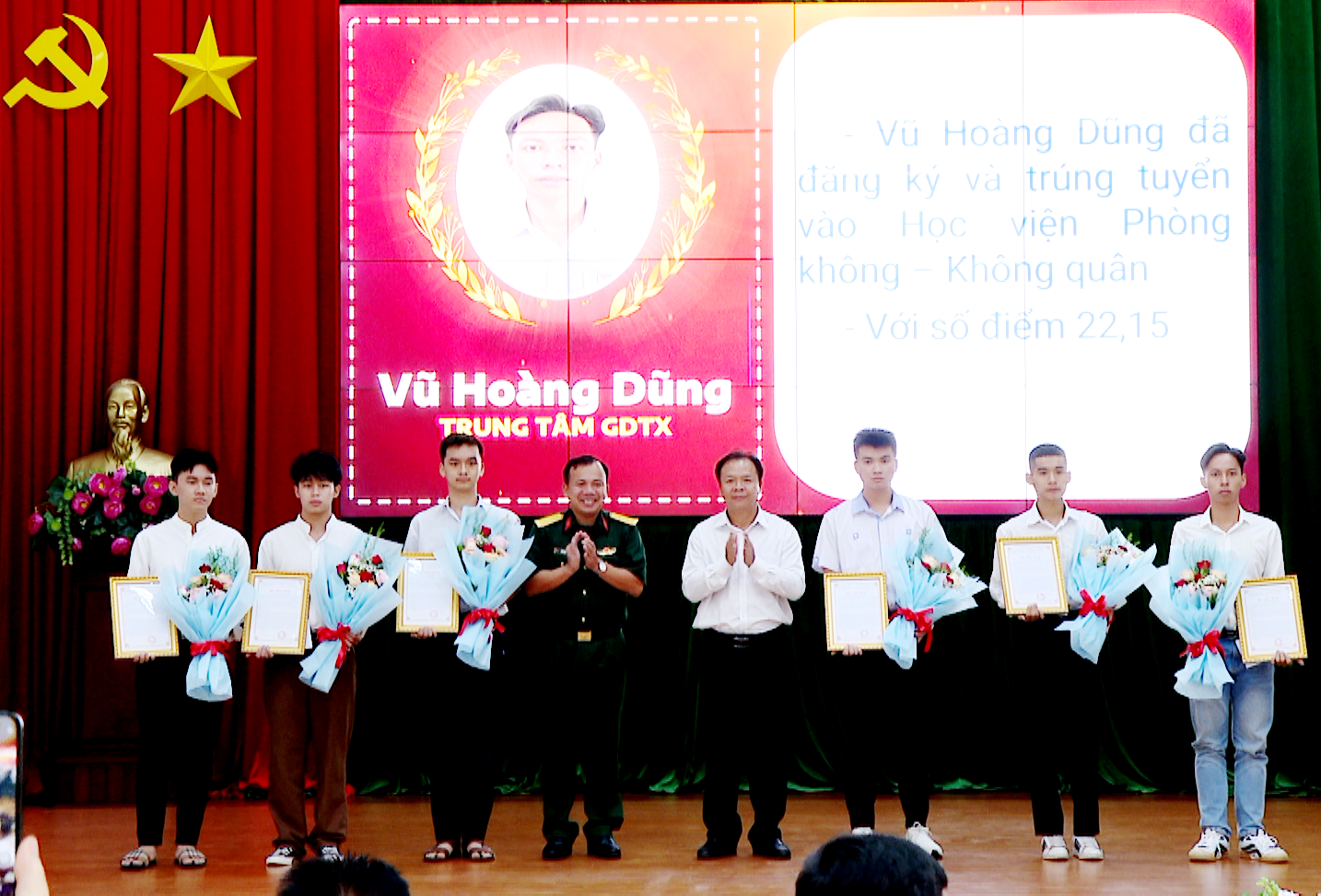 Thay mặt học sinh được tuyên dương phát biểu, em Ngô Hoàng Nghĩa, Trường Trung học phổ thông Nguyễn Khuyến xúc động nói: Chúng em rất vui khi bước đầu hoàn thành ước mơ của mình là học viên của các học viện, nhà trường trong Quân đội, nơi sẽ giúp chúng em tiếp cận với nguồn tri thức mới, cách làm việc khoa học và trau dồi các kỹ năng mềm cần thiết phục vụ cho công việc và cuộc sống sau này, là nơi chúng em trau dồi bản thân để trở thành những chiến sĩ cách mạng, góp phần xây dựng và bảo vệ Tổ quốc Việt Nam xã hội chủ nghĩa. Thay mặt các bạn, em Ngô Hoàng Nghĩa hứa chúng em sẽ học tập thật tốt, phấn đấu hết mình để không phụ lòng mong mỏi của cha mẹ, phấn đấu để mỗi học viên trở thành những bông hoa tô điểm đóng góp vào sự nghiệp xây dựng và bảo vệ vững chắc Tổ quốc.