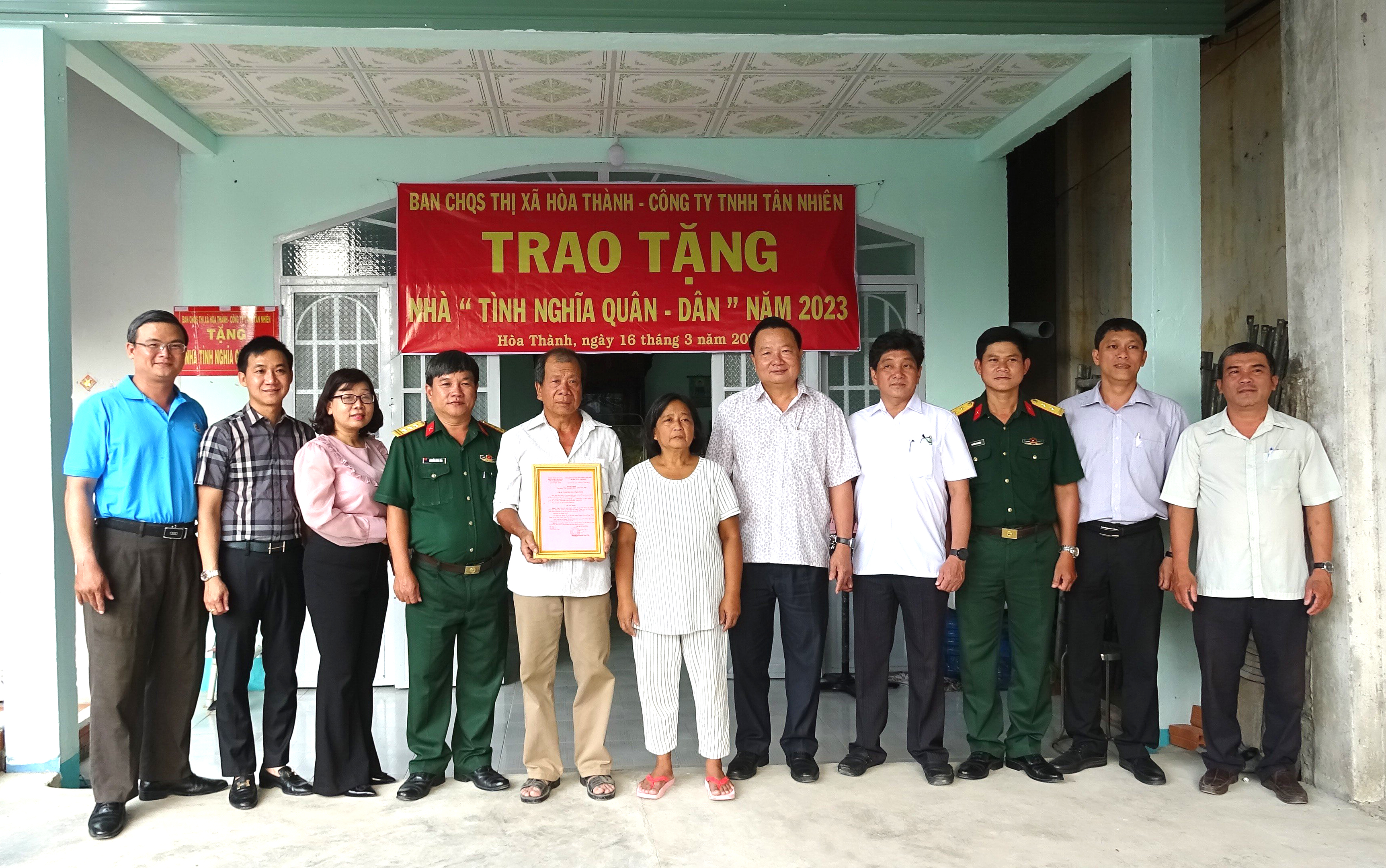 Sau gần hai tháng khởi công xây dựng, căn nhà mới của gia đình đồng chí Trương Minh Tài tại khu phố Long Thành, phường Long Thành Trung, thị xã Hòa Thành được đưa vào sử dụng. Căn nhà có diện tích 65 m2, nền gạch hoa, mái lợp tôn, trần la phông. Kinh phí xây dựng 80 triệu đồng do Ban CHQS thị xã Hòa Thành vận động công ty TNHH Tân Nhiên tài trợ.