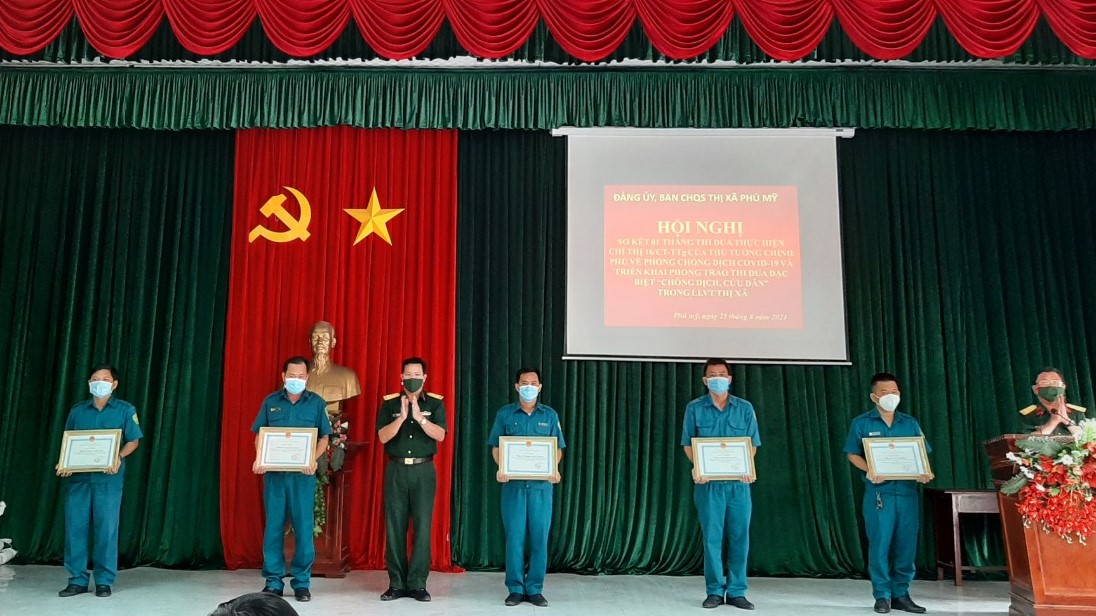 Hưởng ứng phong trào thi đua đặc biệt với chủ đề “Quân đội cùng cả nước chung sức, đồng lòng thi đua phòng, chống và chiến thắng đại dịch Covid-19” do Quân ủy Trung ương, Bộ Quốc phòng phát động và phong trào thi đua đặc biệt “Chống dịch, cứu dân trong LLVT Quân khu 7” của Thường vụ Đảng ủy, Bộ Tư lệnh Quân khu, Đảng ủy, Ban CHQS thị xã Phú Mỹ phát động phong trào thi đua đặc biệt “Chống dịch, cứu dân trong LLVT thị xã”. Theo đó, các tập thể, cá nhân tiếp tục phát huy hơn nữa những kết quả đạt được, nâng cao tinh thần trách nhiệm của mình để huy động tối đa mọi nguồn lực, tập trung nâng cao hiệu quả phòng chống dịch; đổi mới, sáng tạo hiệu quả nội dung, biện pháp phòng chống dịch và cứu giúp Nhân dân, với tinh thần “ở đâu gian khó ở đó có bộ đội”; chủ động kịp thời giúp đỡ chính quyền và cứu giúp Nhân dân bằng tất cả khả năng của mình; tuyệt đối không để Nhân dân đói khổ, khó khăn, thiếu thốn.