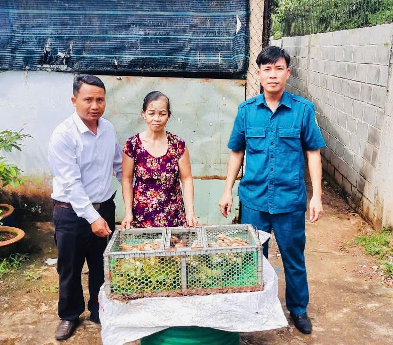 Đồng chí Trương Mạnh Tuấn, Phó Chỉ huy trưởng Ban CHQS xã Sông Xoài trao gà giống cho gia đình bà Nguyễn Thị Sa.