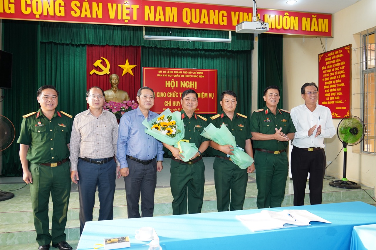 Thủ trưởng Bộ Tư lệnh Thành phố và lãnh đạo Huyện ủy Hóc Môn chúc mừng hai đồng chí nhận quyết định.