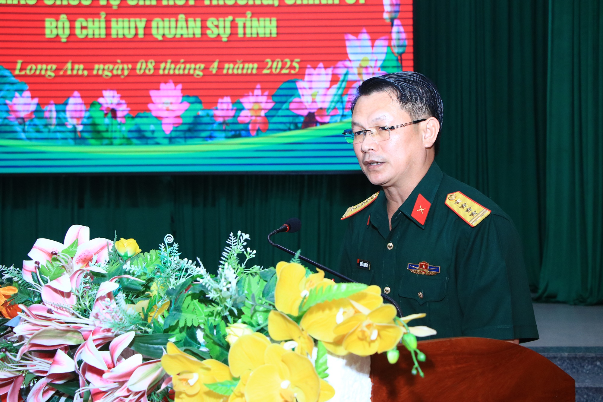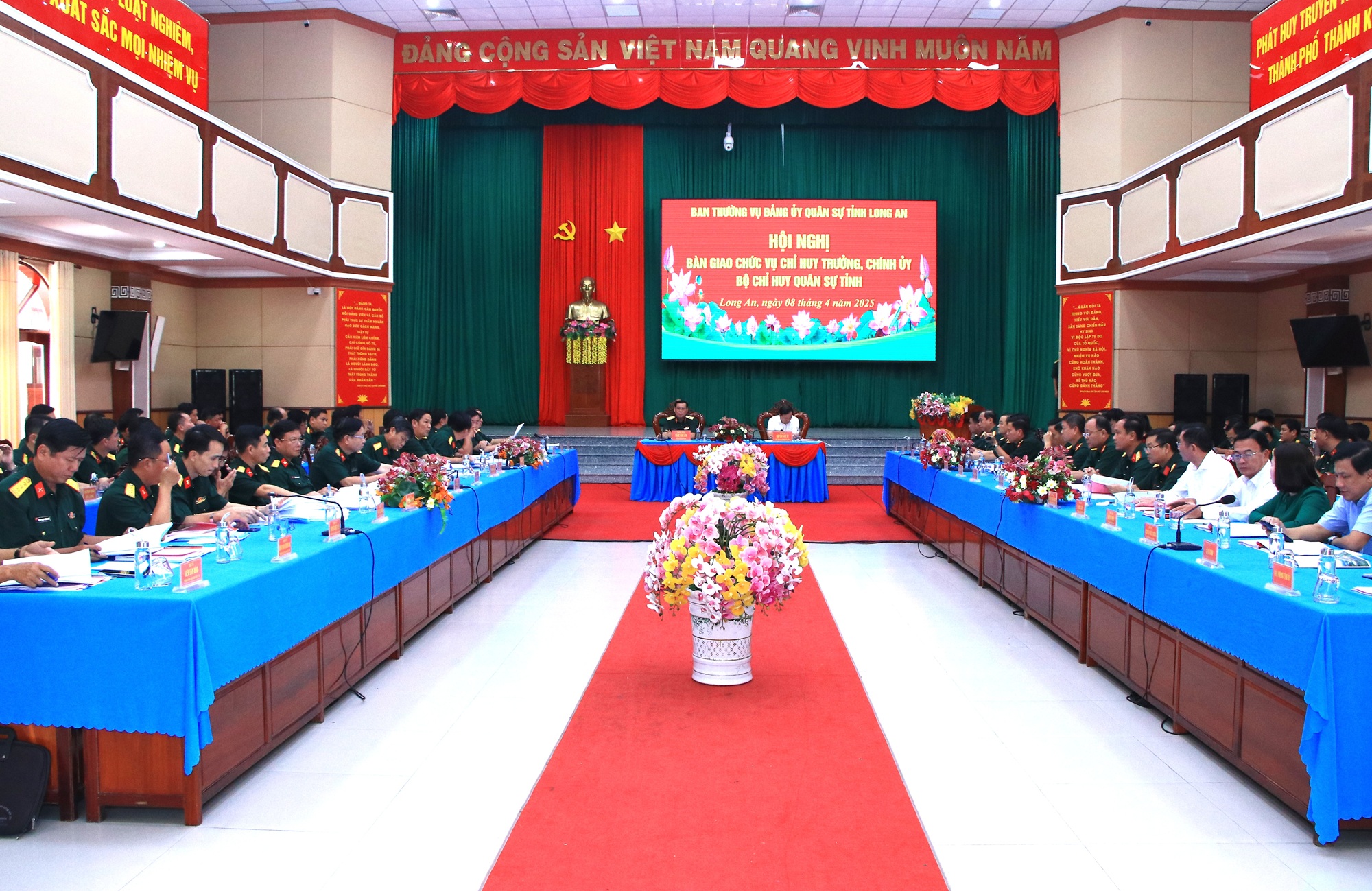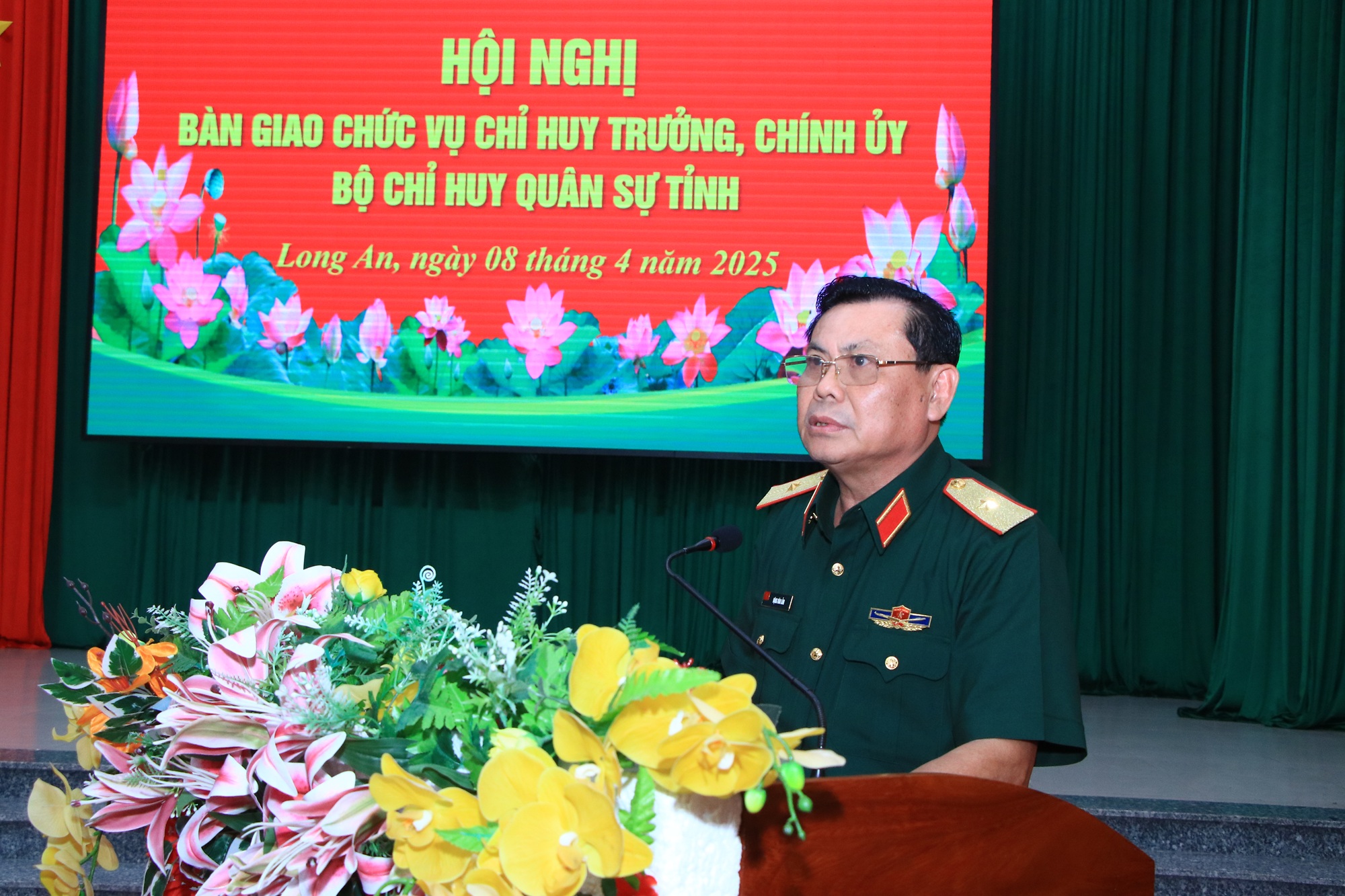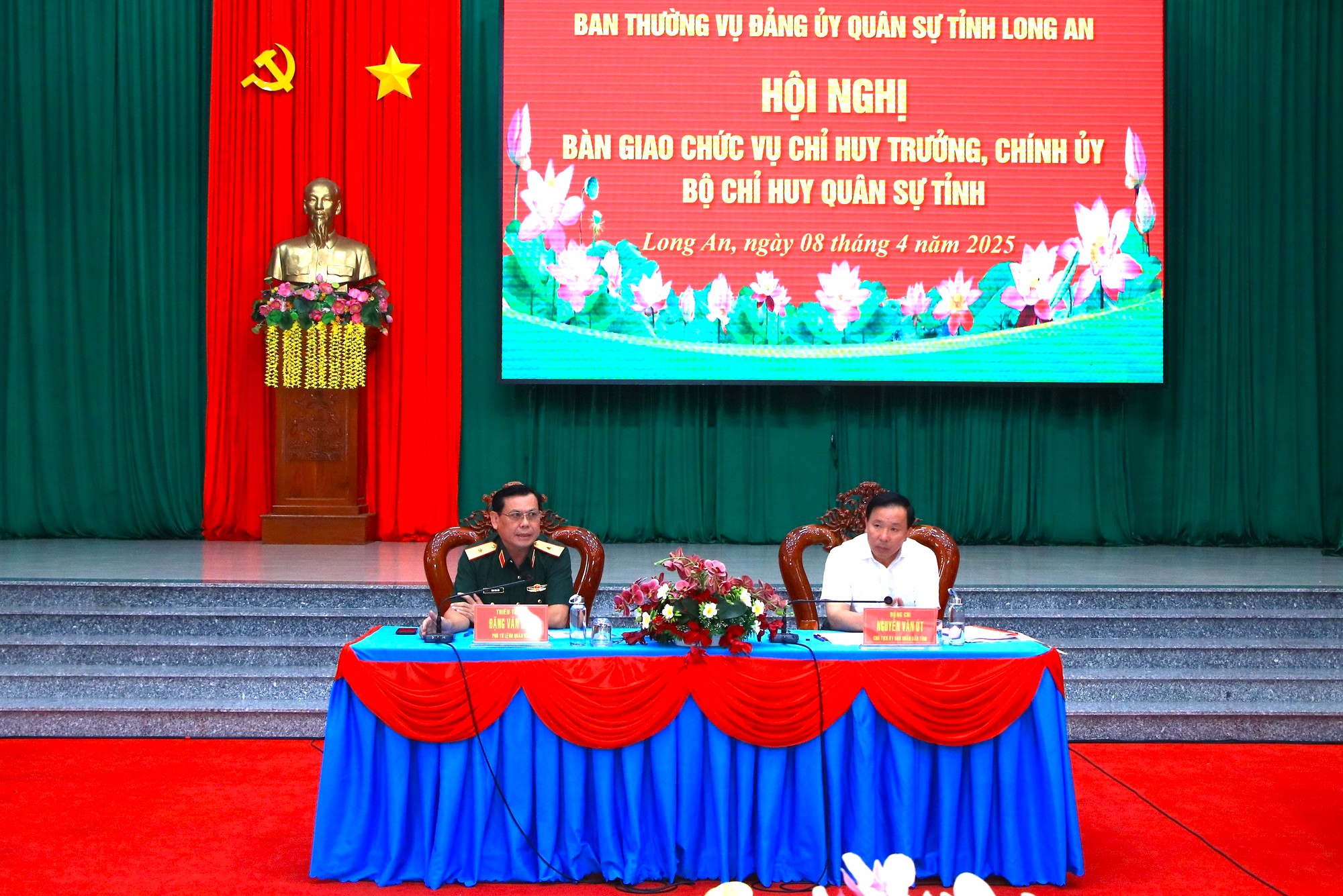 (QK7 Online) - Chiều ngày 8/4, Đảng ủy, Bộ CHQS tỉnh Long An tổ chức hội nghị bàn giao chức trách, nhiệm vụ Chỉ huy trưởng, Chính ủy Bộ CHQS tỉnh. Thiếu tướng Đặng Văn Lẫm, Ủy viên Ban Thường vụ Đảng ủy Quân khu, Phó Tư lệnh Quân khu 7 và đồng chí Nguyễn Văn Út, Phó Bí thư Tỉnh ủy, Chủ tịch UBND tỉnh chủ trì hội nghị.