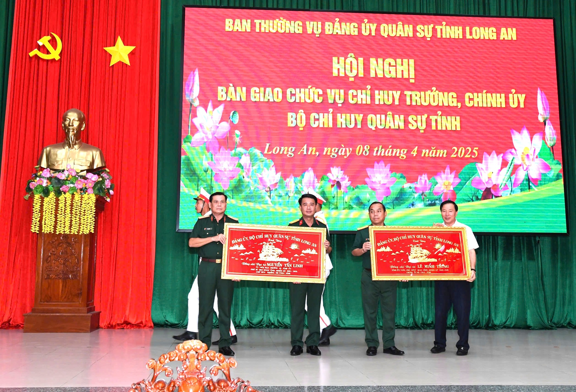 Lãnh đạo Quân khu và UBND tỉnh Long An tặng bức khánh chúc mừng Đại tá Nguyễn Tấn Linh và Đại tá Lê Minh Trung nhận nhiệm vụ mới.