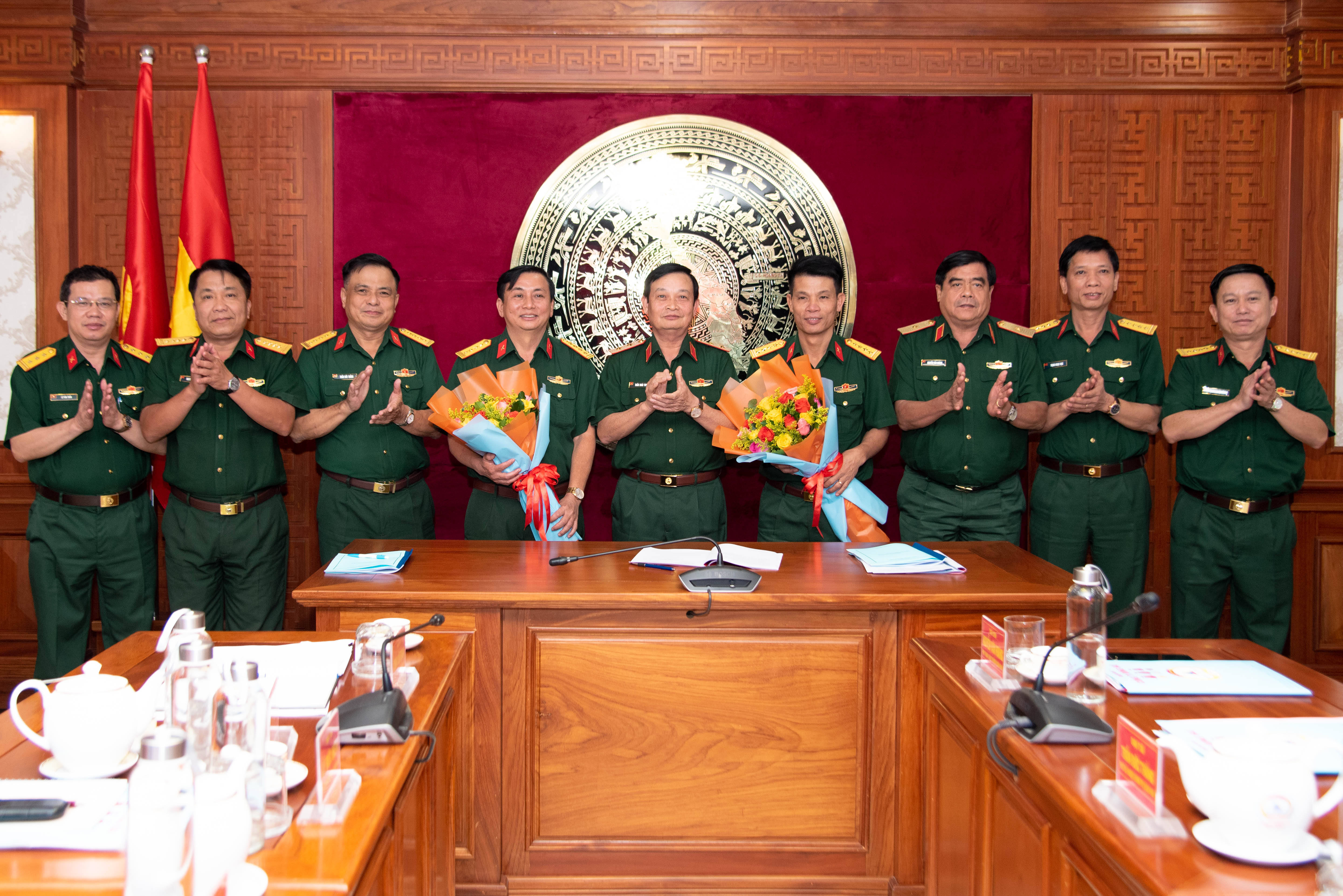 Trung tướng Trần Hoài Trung cùng thủ trưởng các cơ quan Quân khu chúc mừng các đồng chí nhận và bàn giao.