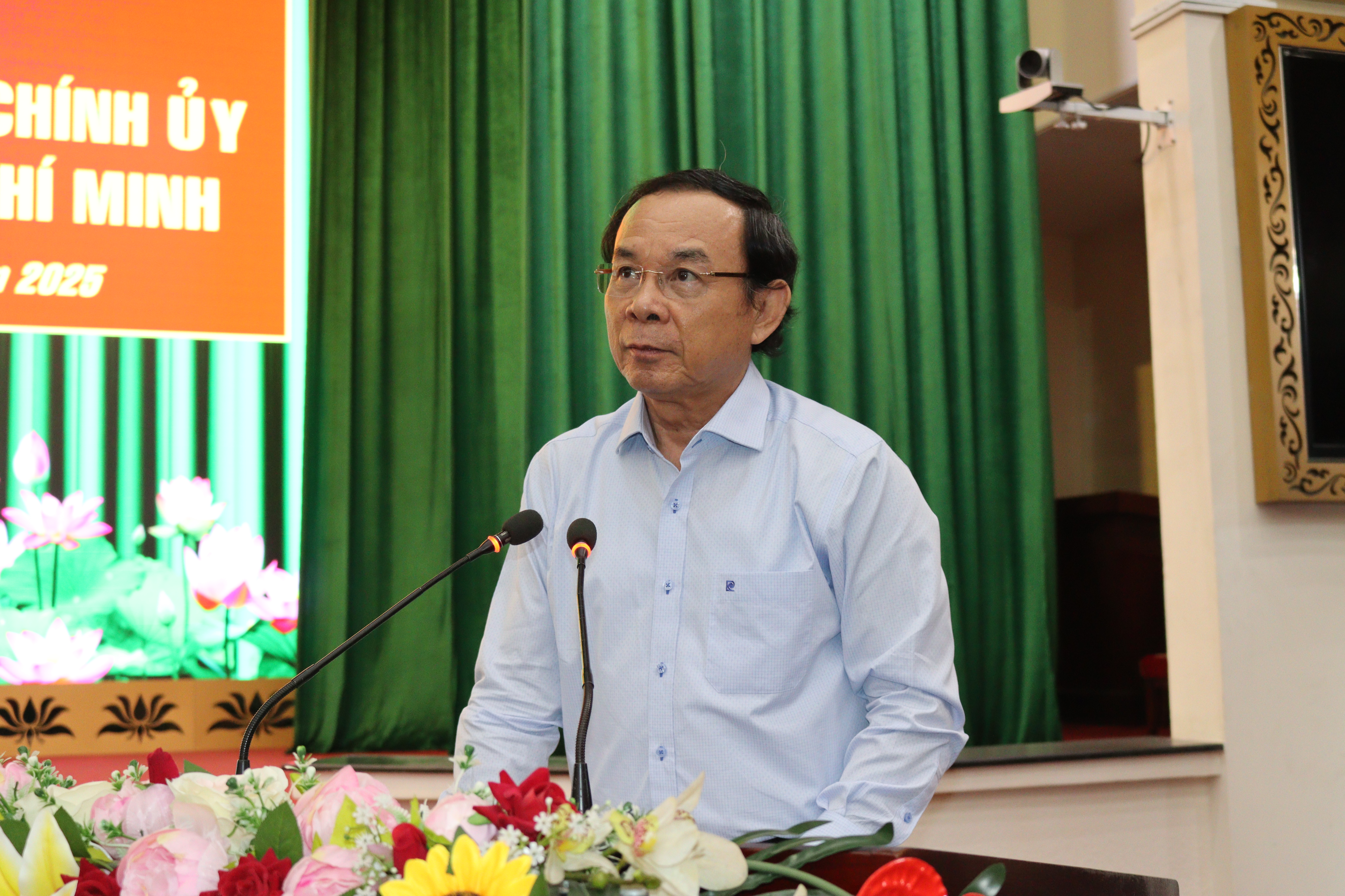 Đồng chí Nguyễn Văn Nên, Uỷ viên Bộ Chính trị, Bí thư Thành uỷ, Bí thư Đảng uỷ Quân sự TPHCM phát biểu chúc mừng các đồng chí.