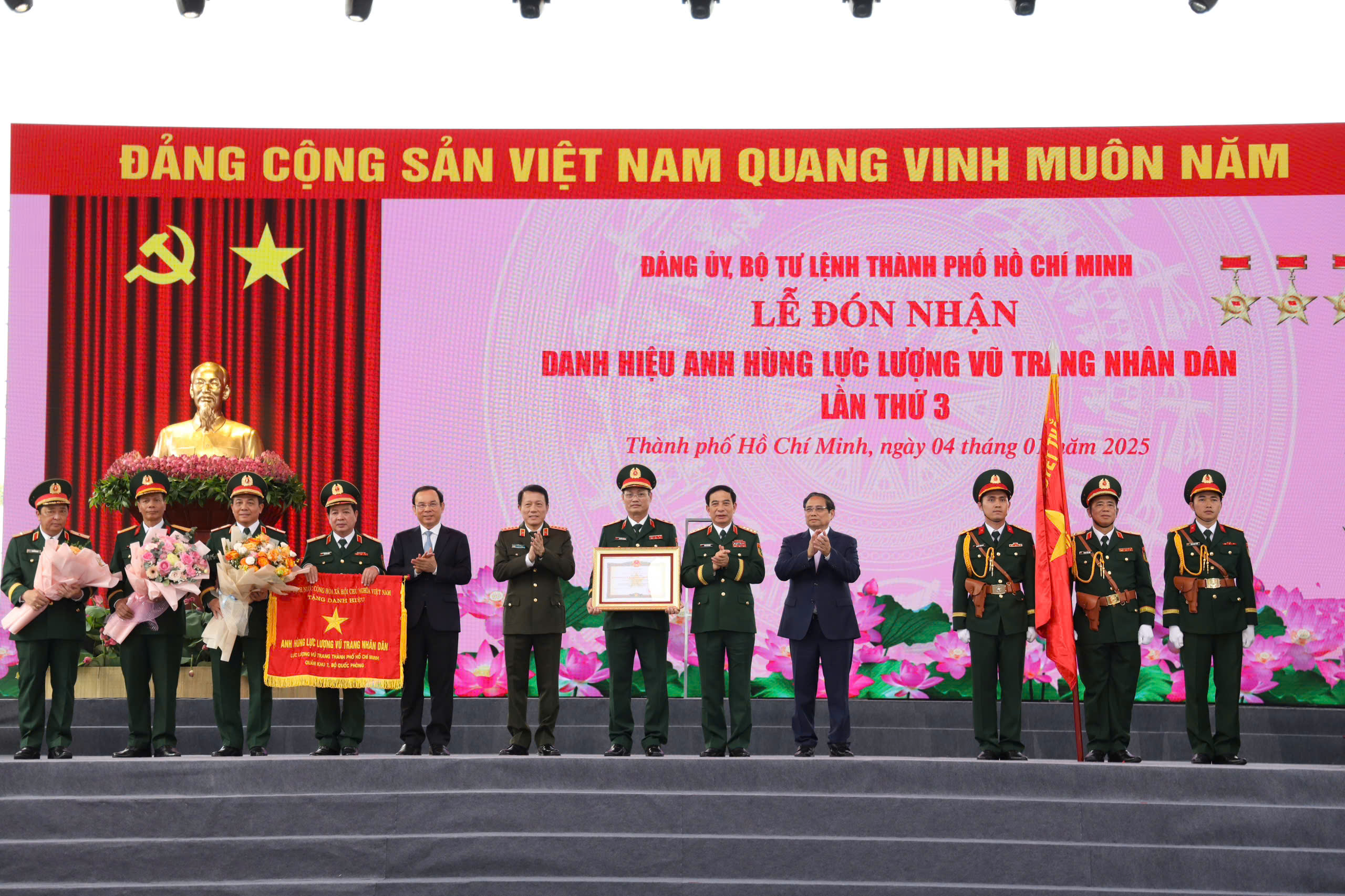 Thủ tướng Chính phủ Phạm Minh Chính và các đại biểu chúc mừng LLVT TPHCM nhận danh hiệu Anh hùng LLVT Nhân dân lần 3. Ảnh: Lê Tiến.