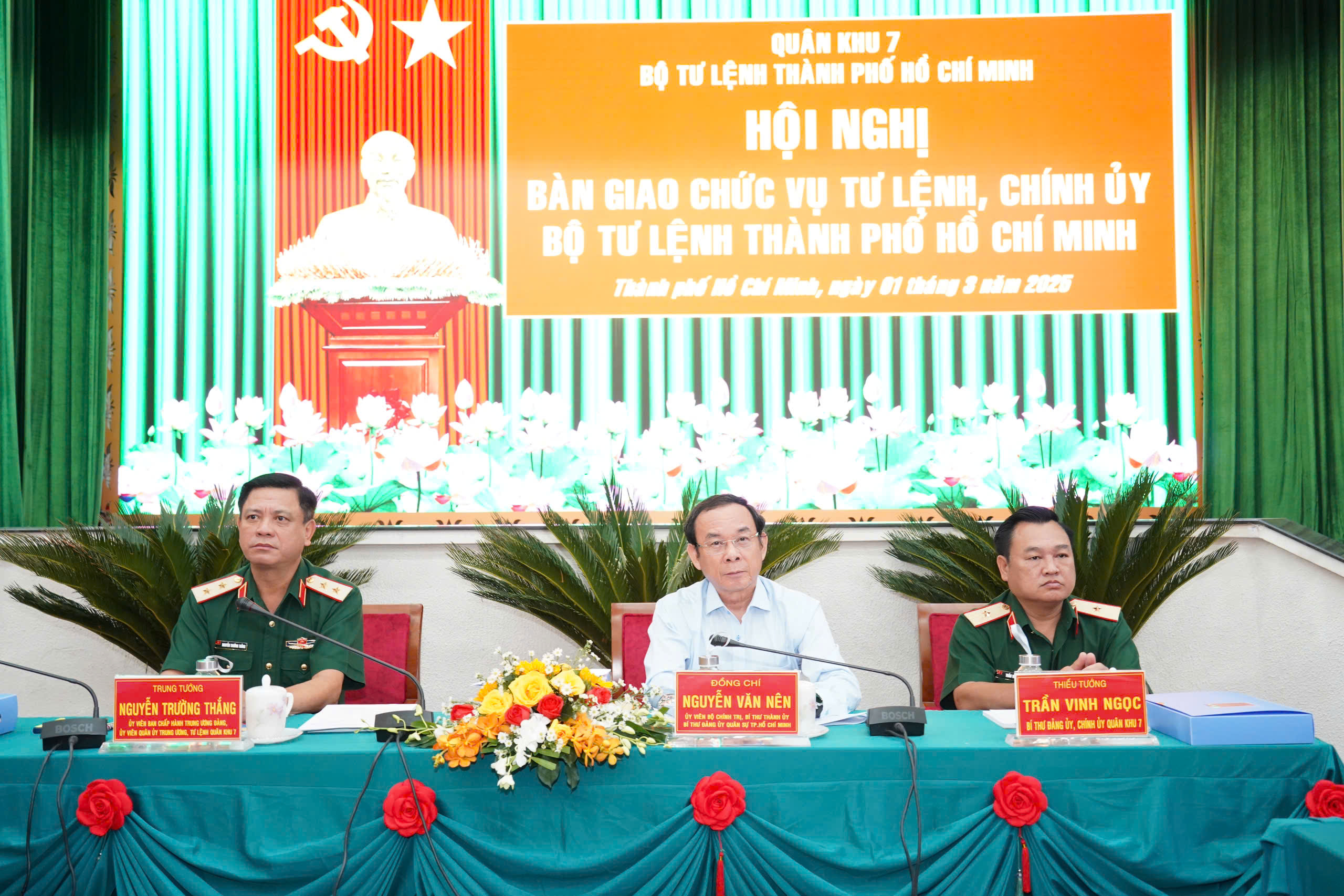 (QK7 Online) - Chiều ngày 1/3, Bộ Tư lệnh TPHCM tổ chức Hội nghị bàn giao chức vụ Tư lệnh, Chính uỷ Bộ Tư lệnh TPHCM. Trung tướng Nguyễn Trường Thắng, Ủy viên Trung ương Đảng, Ủy viên Quân ủy Trung ương, Tư lệnh Quân khu; Thiếu tướng Trần Vinh Ngọc, Chính uỷ Quân khu và đồng chí Nguyễn Văn Nên, Uỷ viên Bộ Chính trị, Bí thư Thành uỷ, Bí thư Đảng uỷ Quân sự TPHCM đồng chủ trì hội nghị.