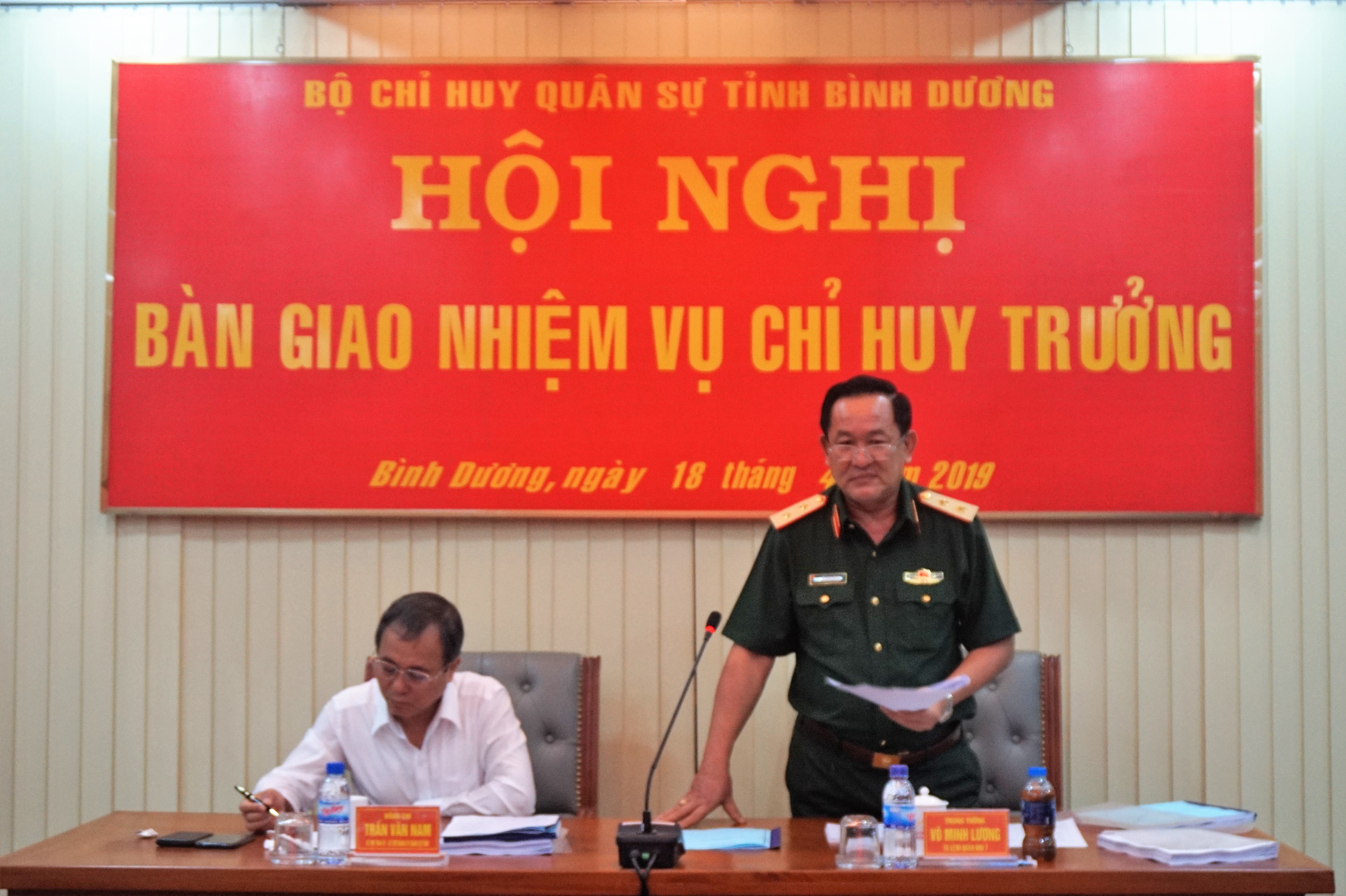 (QK7 Online) - Ngày 18/4/2019, Bộ Chỉ huy Quân sự tỉnh Bình Dương tổ chức hội nghị bàn giao nhiệm vụ Chỉ huy trưởng Bộ CHQS tỉnh.Trung tướng Võ Minh Lương, Ủy viên Trung ương Đảng, Tư lệnh Quân khu 7 dự và chủ trì hội nghị. Dự hội nghị có các đồng chí Trần Văn Nam, Bí thư Tỉnh ủy, Bí thư Đảng ủy Quân sự tỉnh; Trần Thanh Liêm, Chủ tịch UBND tỉnh cùng thủ trưởng các cơ quan Quân khu 7 và Ban Tổ chức Tỉnh ủy.