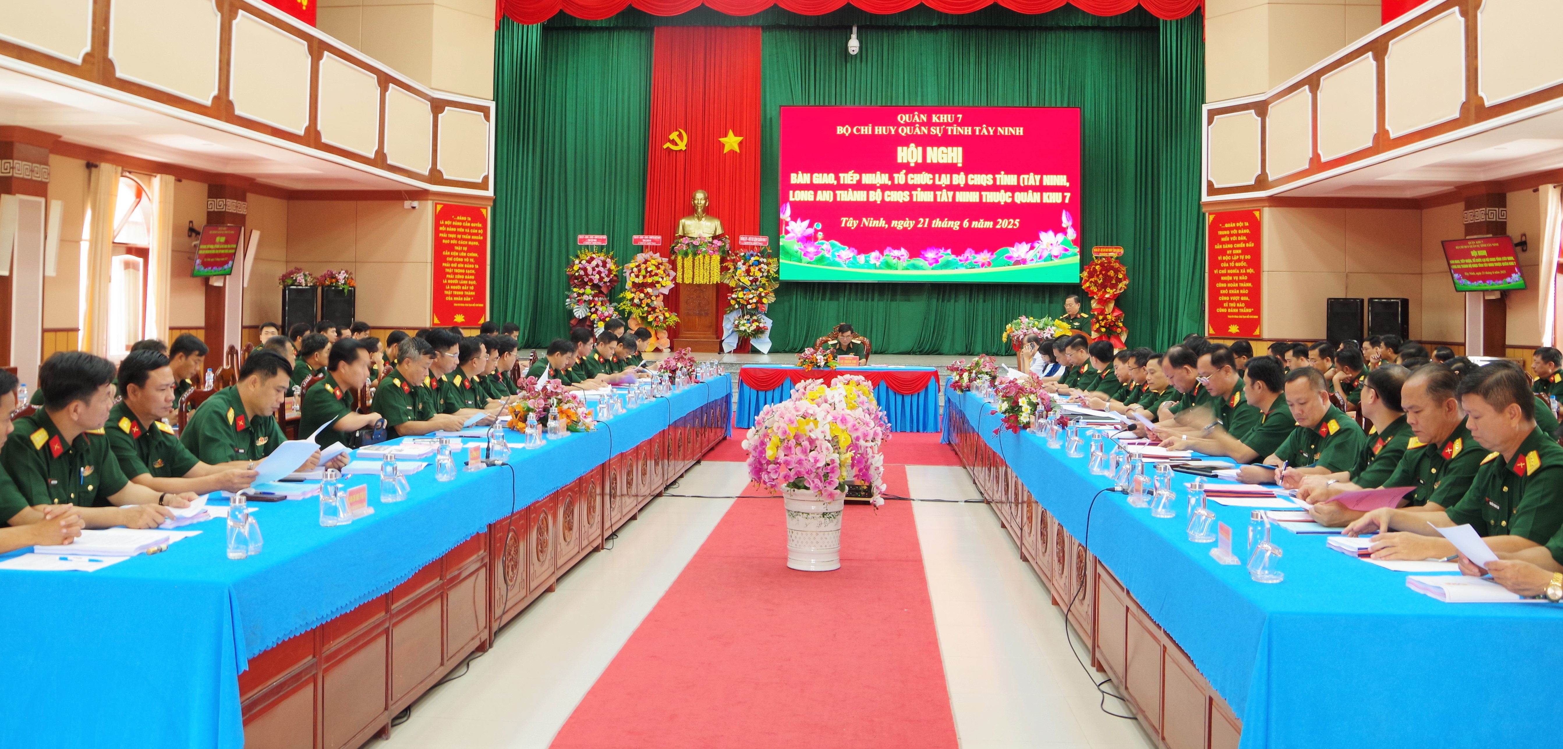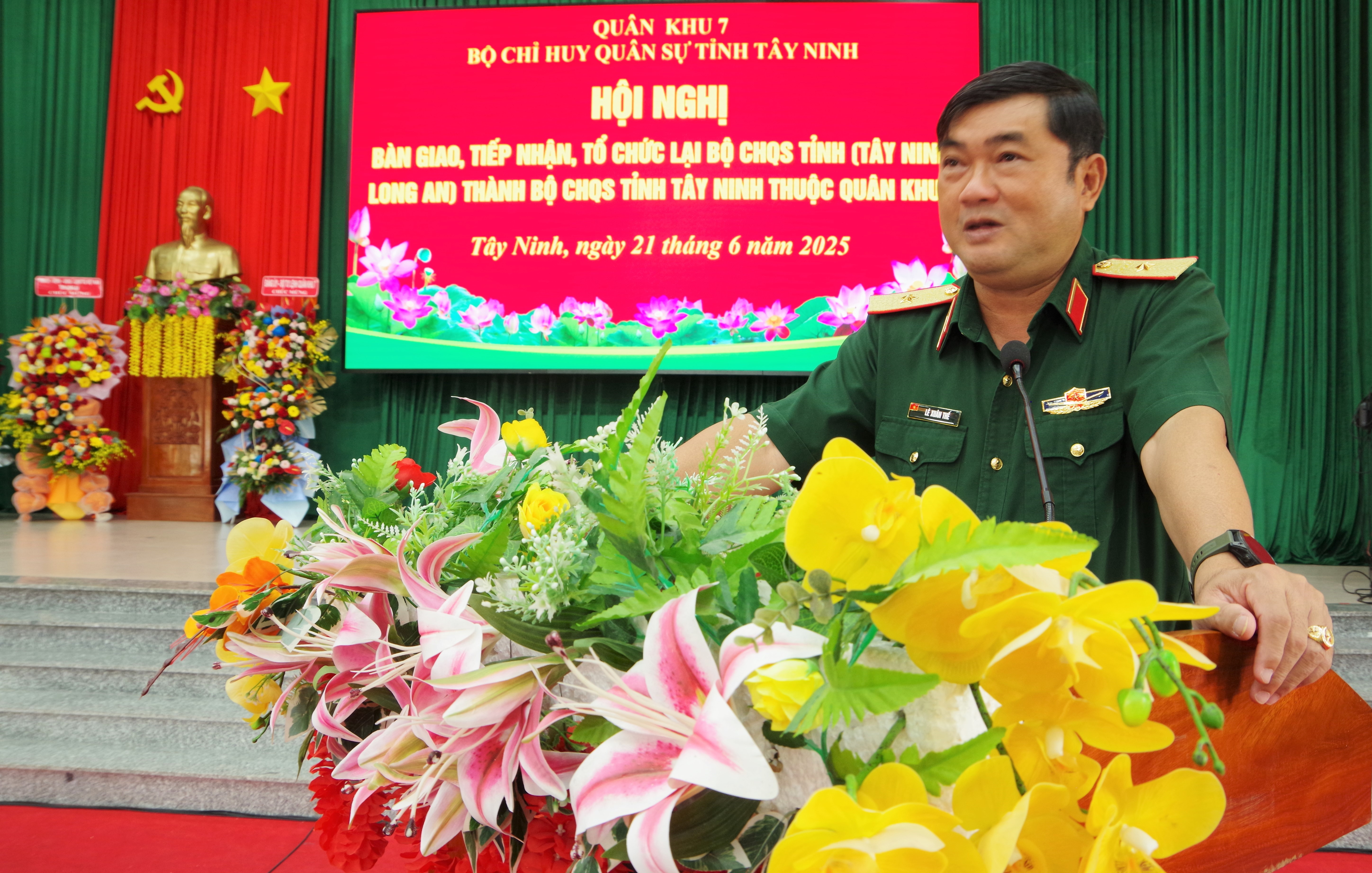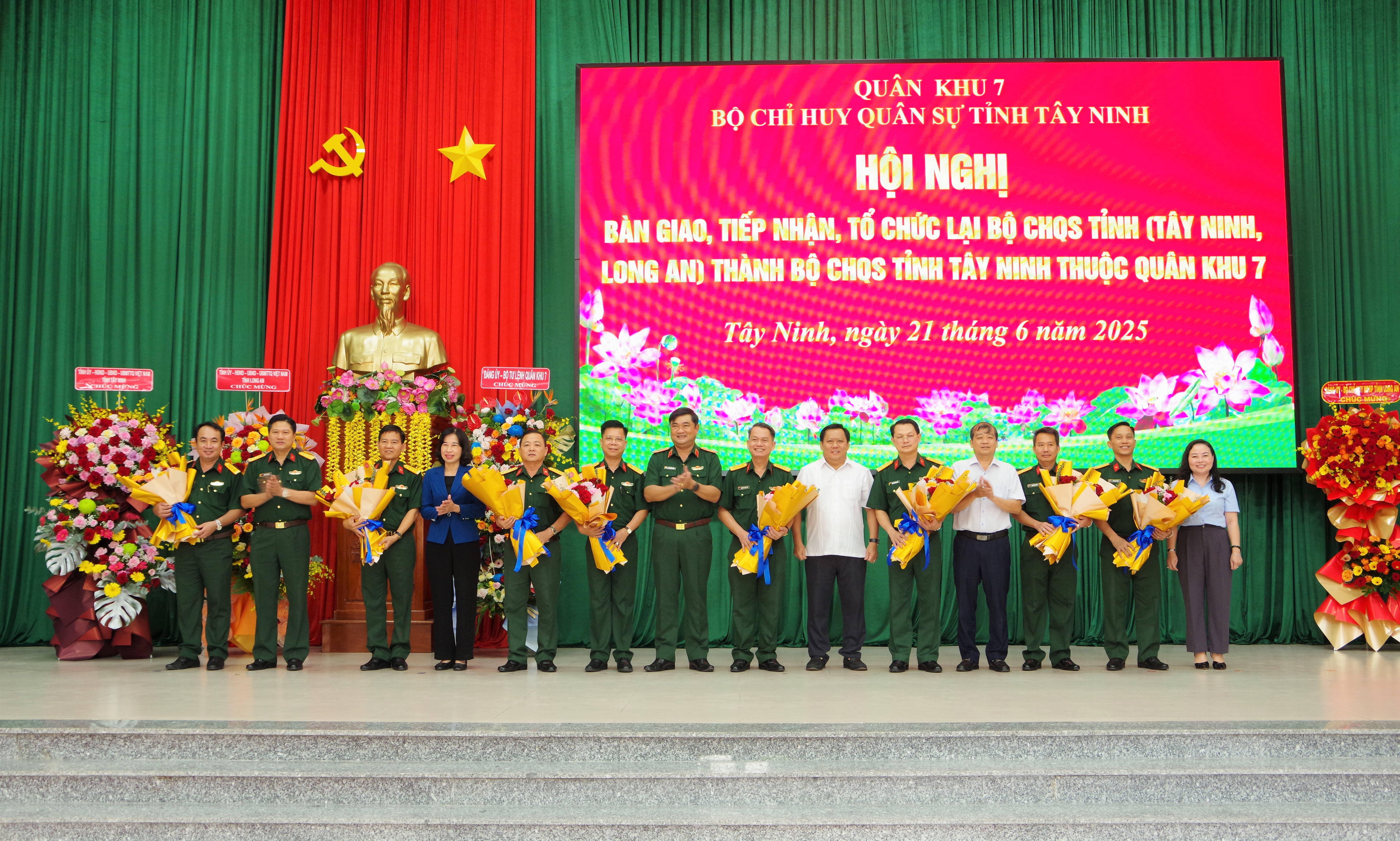 Thủ trưởng Bộ Tư lệnh Quân khu 7 và lãnh đạo địa phương tặng hoa chúc mừng các đồng chí trong Đảng ủy, Bộ CHQS tỉnh Tây Ninh mới.