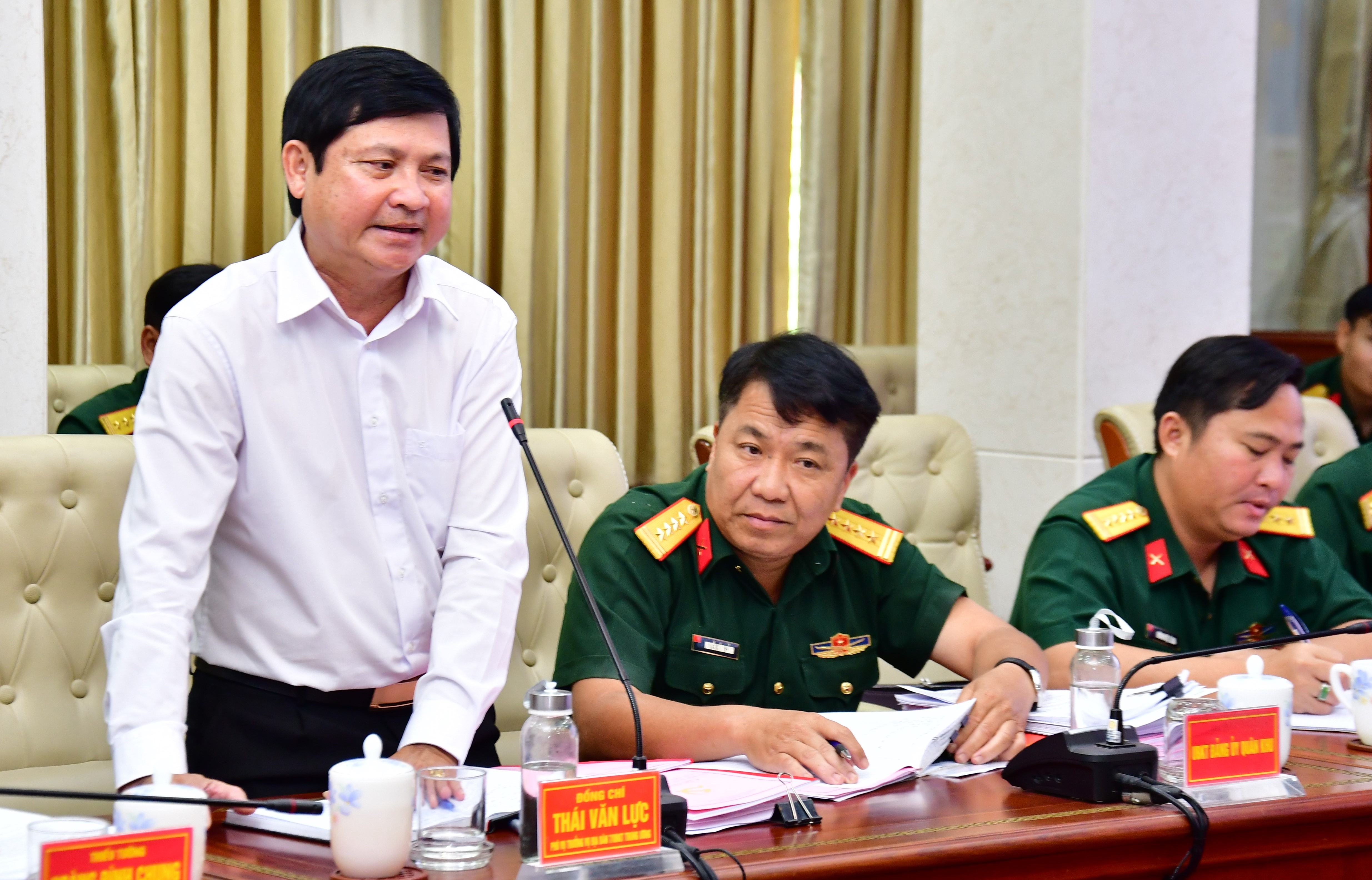 Thiếu tướng Hoàng Đình Chung, Ủy viên Ban Thường vụ Đảng ủy, Chủ nhiệm Chính trị Quân khu phát biểu tại hội nghị. Đồng chí Thái Văn Lực, Phó Vụ trưởng Vụ địa bàn 7, UBKT Trung ương phát biểu tại hội nghị.