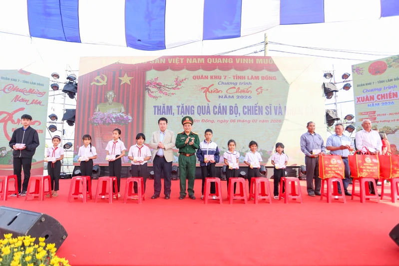 (QK7 Online) – Trong khuôn khổ chương trình “Xuân Chiến sĩ” lần XI năm 2026, sáng ngày 5/2, Thường vụ Đảng uỷ, Bộ Tư lệnh Quân khu 7 và Tỉnh uỷ, HĐND, UBND, UBMTTQVN tỉnh Lâm Đồng tổ chức thăm, tặng quà cho bà con Nhân dân, các đơn vị Quân đội, trường học, các tổ chức tôn giáo, trưởng bon và các gia đình chính sách trên địa bàn xã Thuận Hạnh và xã Tuy Đức.
