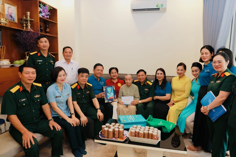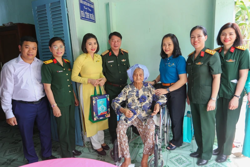 Đại tá Nguyễn Thị Thu Hiền, Trưởng Ban Phụ nữ Quân đội, Ủy viên Thường trực Ban VSTBCPN Bộ Quốc phòng và đoàn công tác tặng quà Mẹ VNAH Trần Thị Hồng.