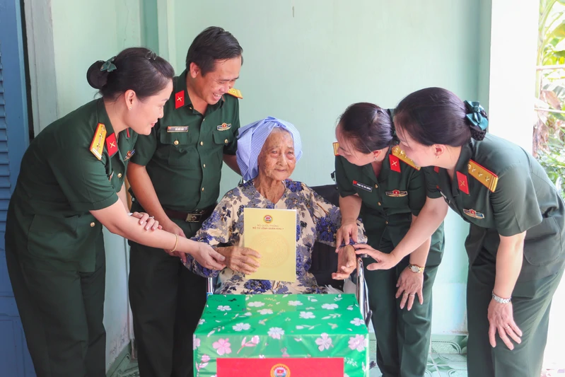 Phó Cục trưởng Cục Cán bộ, Ủy viên Ban VSTBCPN Bộ Quốc phòng và đoàn công tác tặng quà Mẹ VNAH Nguyễn Thị Á.