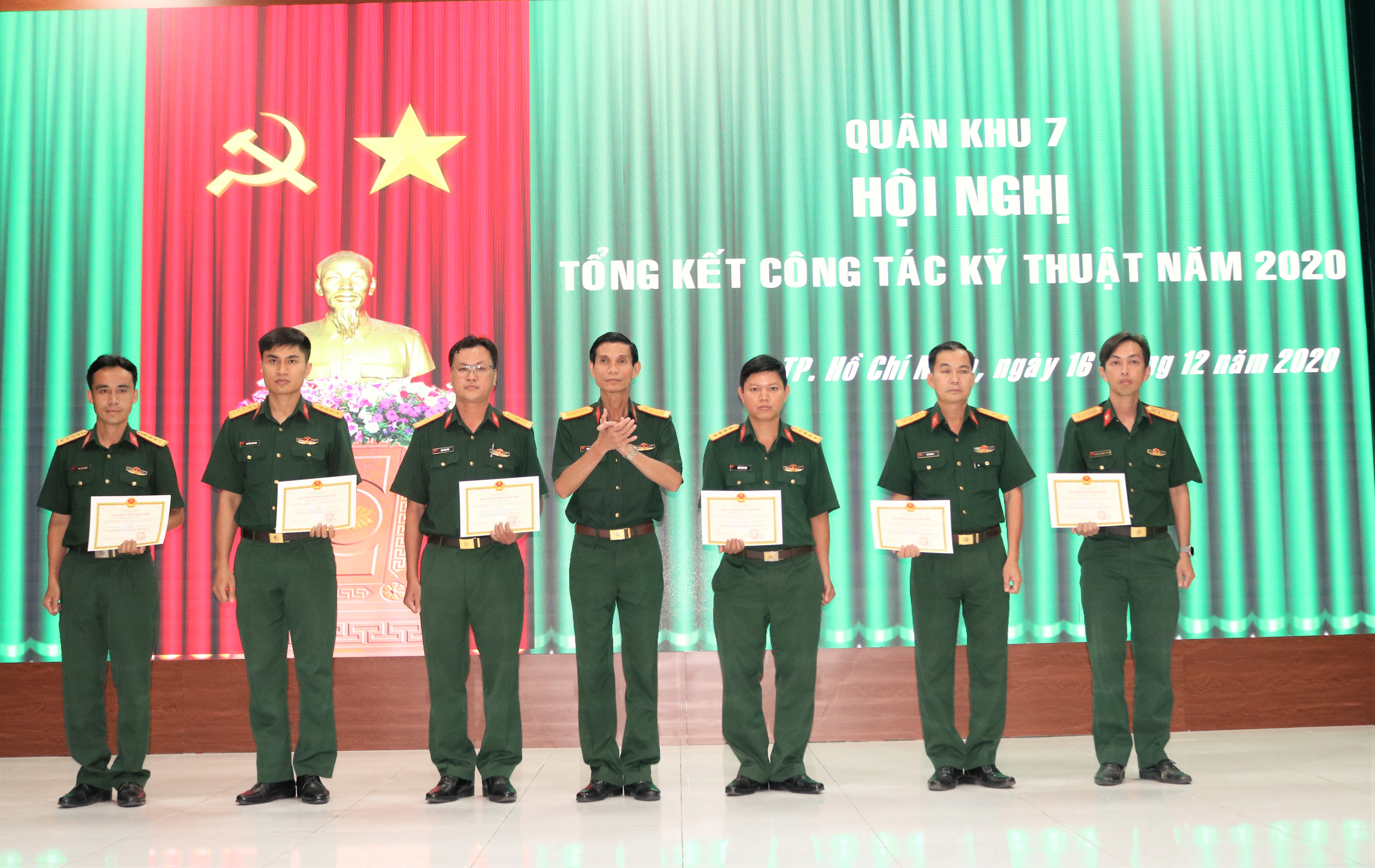Tại hội nghị, Đại tá Nguyễn Văn Thành, Chủ nhiệm Kỹ thuật Quân khu trao giấy chứng nhận cho đại diện các nhóm tác giả có 2 sáng kiến đạt giải A và 4 sáng kiến đạt giải B cấp Ngành Kỹ thuật Quân khu năm 2020.