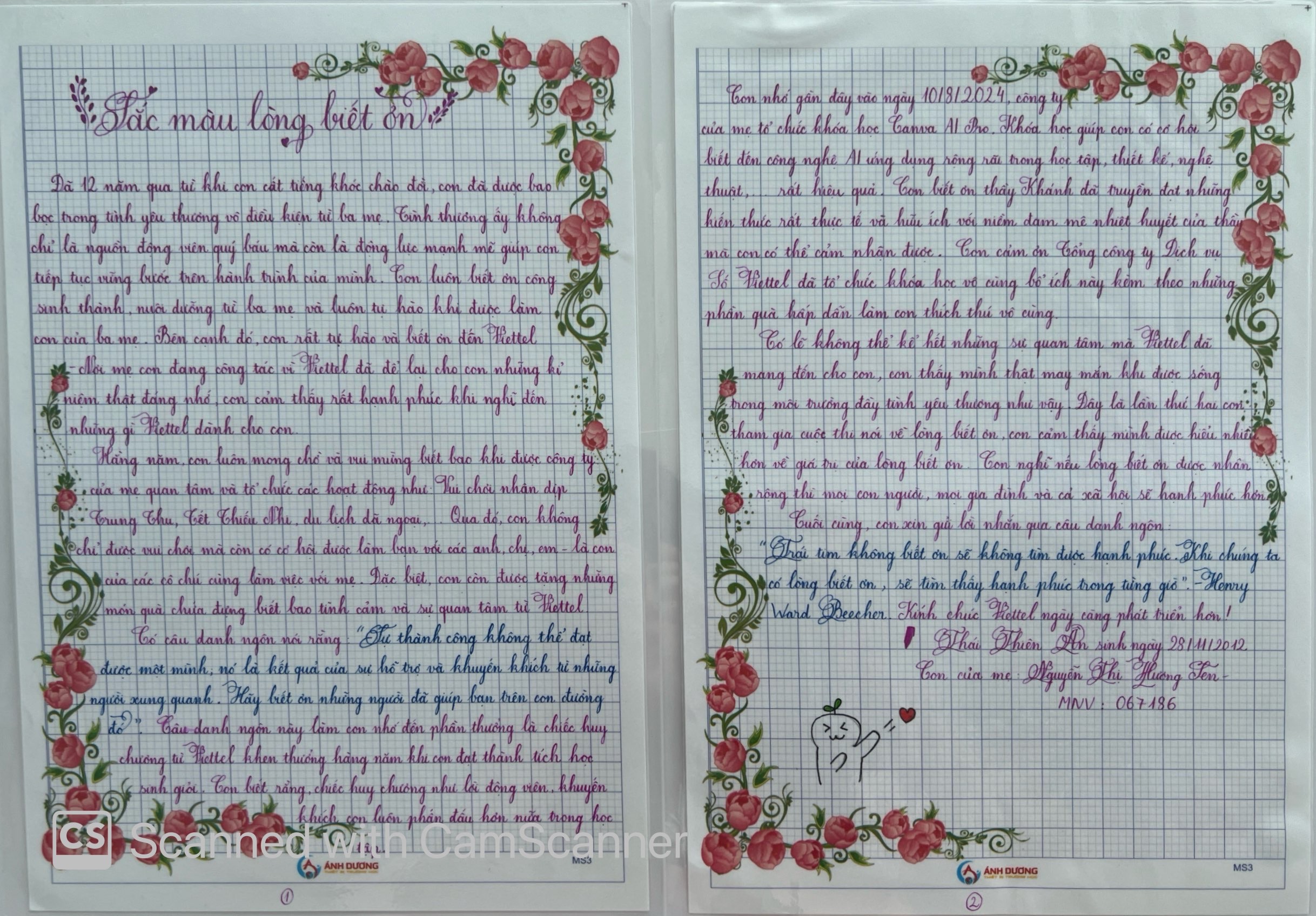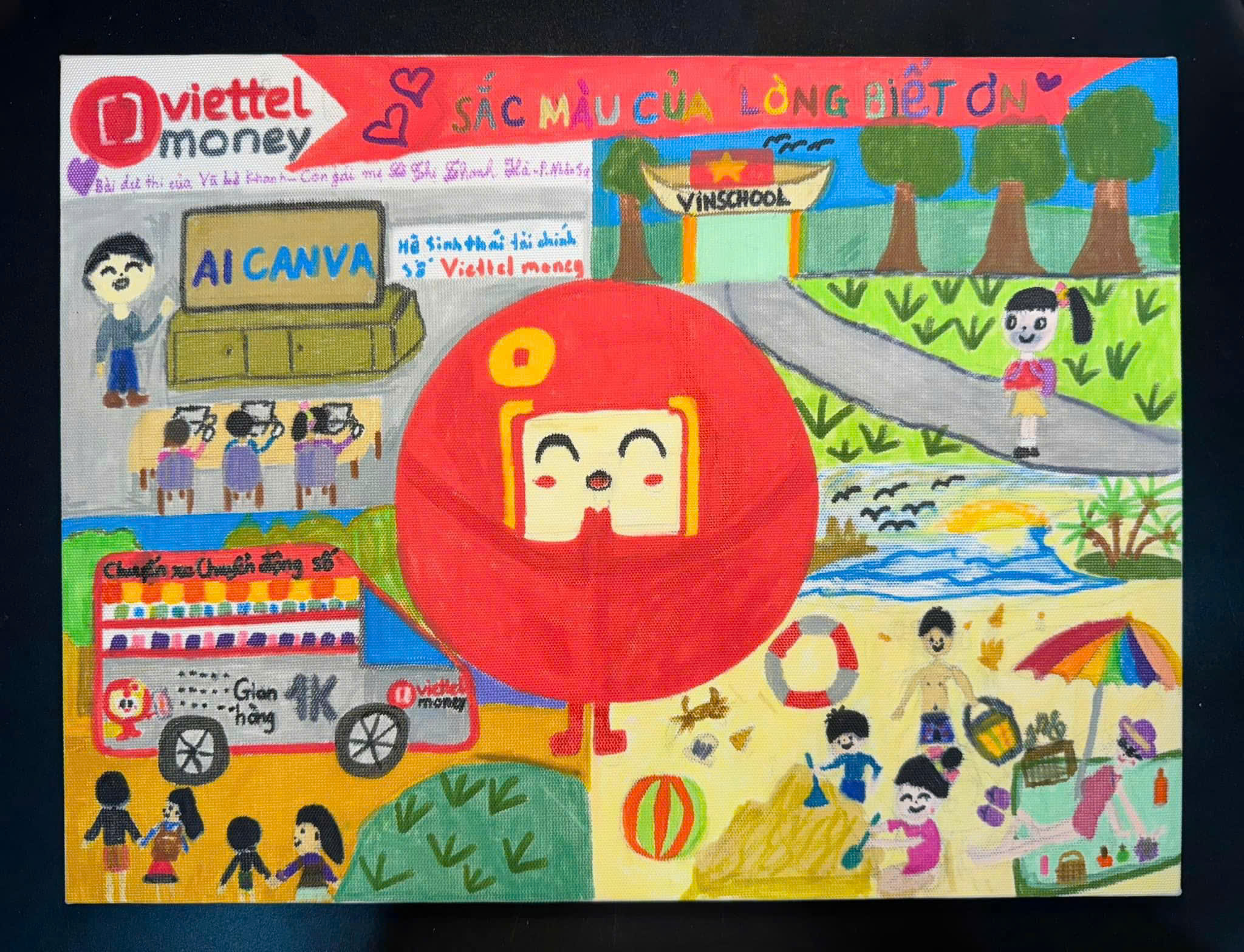 Giữa bao điều các con biết ơn trong cuộc sống, cái tên “Viettel”, “Viettel Money” tự hào xuất hiện tự nhiên, thú vị qua ngòi bút, bảng màu của các em. Một em bé chia sẻ trong lá thư của mình: “Con biết ơn công ty của mẹ vì đã tổ chức những sự kiện ý nghĩa mà con được tham gia trực tiếp như: Trung thu, lớp học AI Canva… Con còn được mẹ kể về chương trình hỗ trợ những người dân ở trên vùng cao “Chuyến xe chuyển động số”. Con cảm ơn Viettel Money. Con cảm ơn gia đình và thầy cô”.