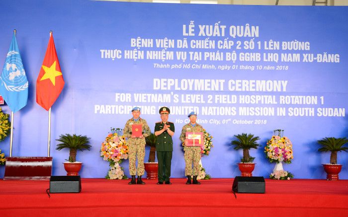 Tại buổi lễ, Thượng tướng Phạm Ngọc Minh đã công bố Quyết định của Chủ tịch nước về việc cử Bệnh viện dã chiến cấp 2 số 1 thực hiện nhiệm vụ gìn giữ hòa bình Liên hợp quốc tại Nam Sudan và thay mặt Bộ Quốc phòng, Bộ Tổng tham mưu giao nhiệm vụ cho bệnh viện lên đường làm nhiệm vụ ở Phái bộ Nam Sudan. Thượng tướng Nguyễn Chí Vịnh đã thừa ủy quyền của Chủ tịch nước trao Quyết định của Chủ tịch nước về việc cử Bệnh viện dã chiến cấp 2 số 1 đi thực hiện nhiệm vụ ở Phái bộ Nam Sudan và trao Quốc kỳ cho đại diện Bệnh viện dã chiến cấp 2 số 1.