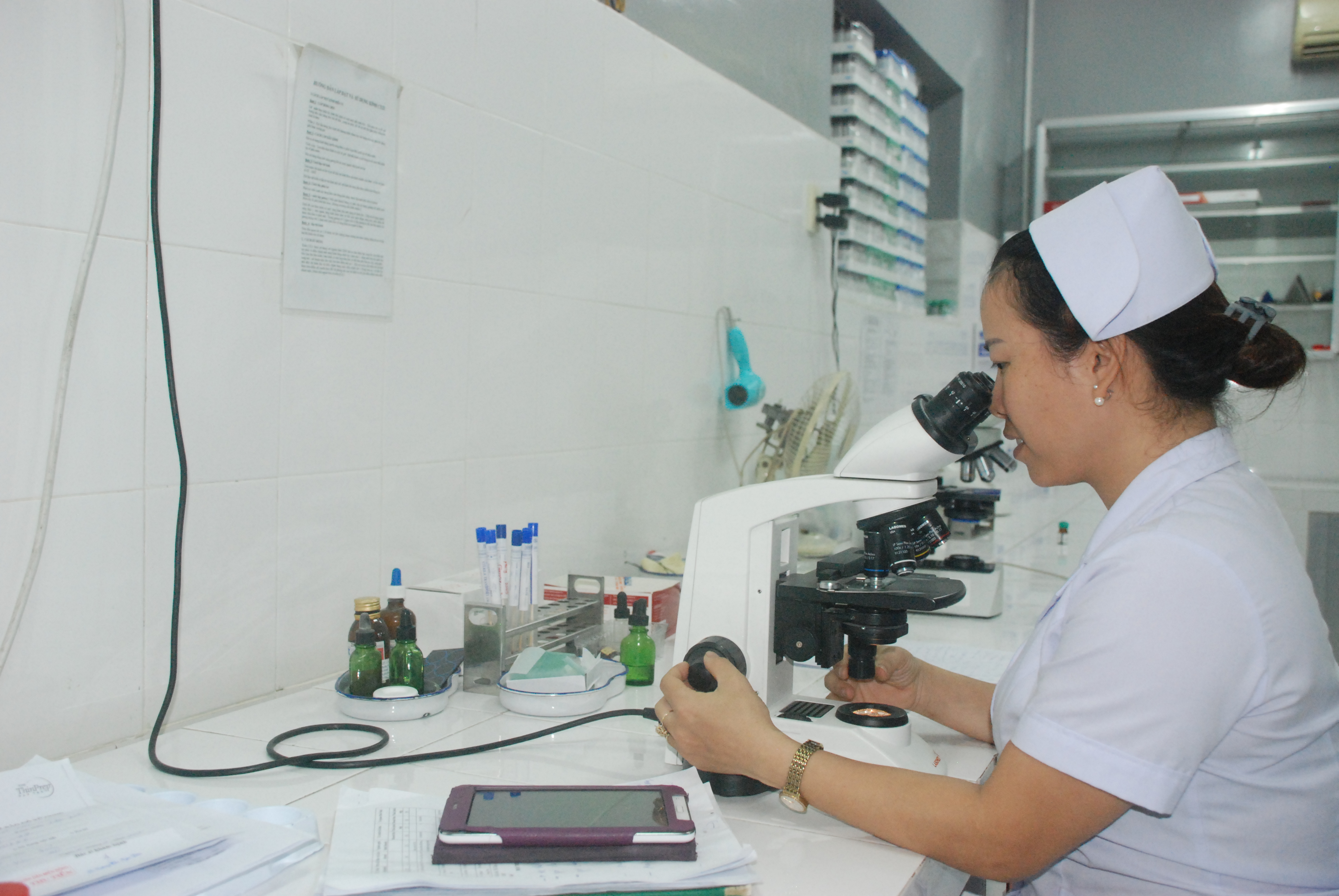 Kỹ thuật viên thực hiện tổng phân tích tế bào máu và soi tươi nhuộm gram