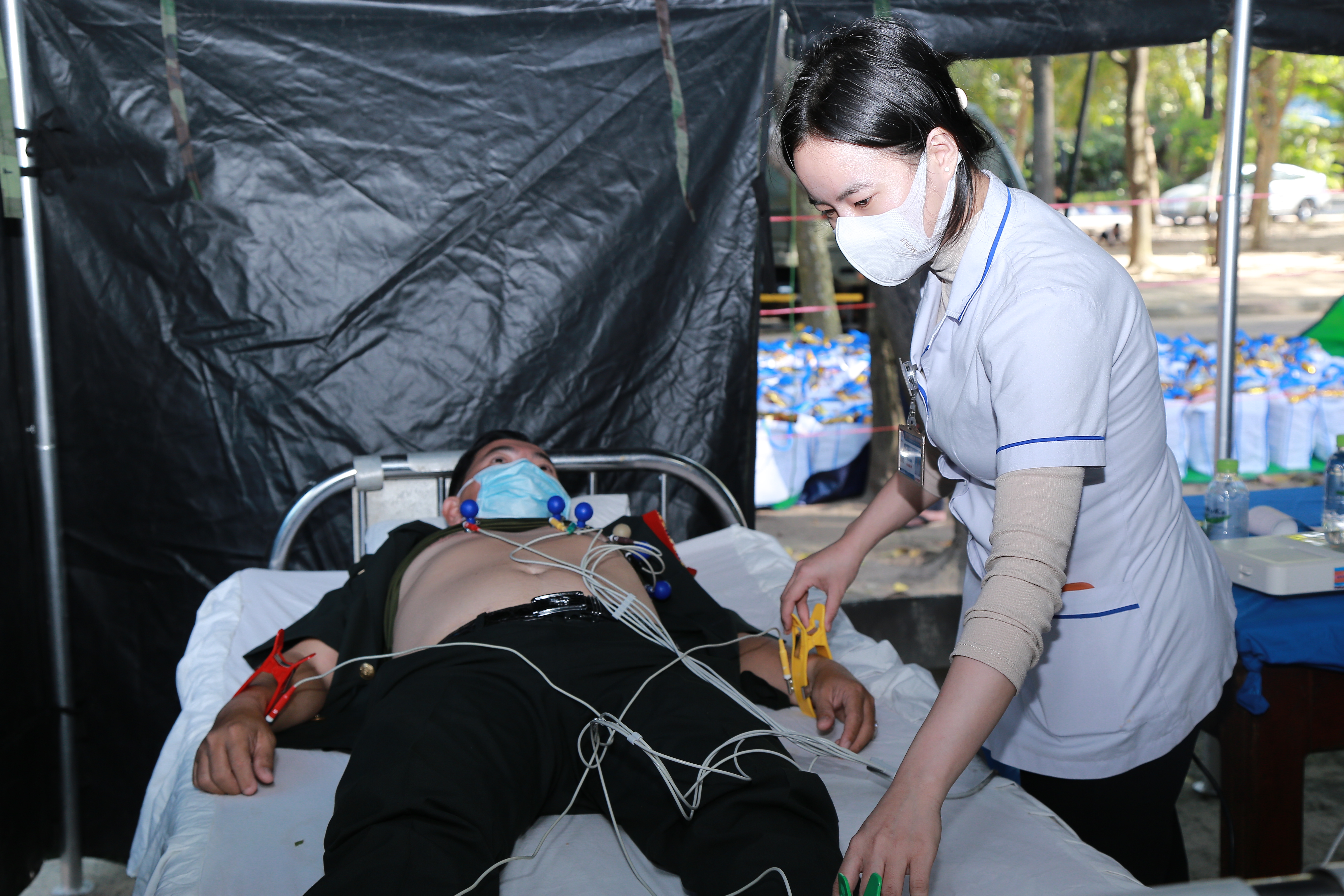 Các y bác sĩ tiến hành đo điện tim và siêu âm cho người dân.