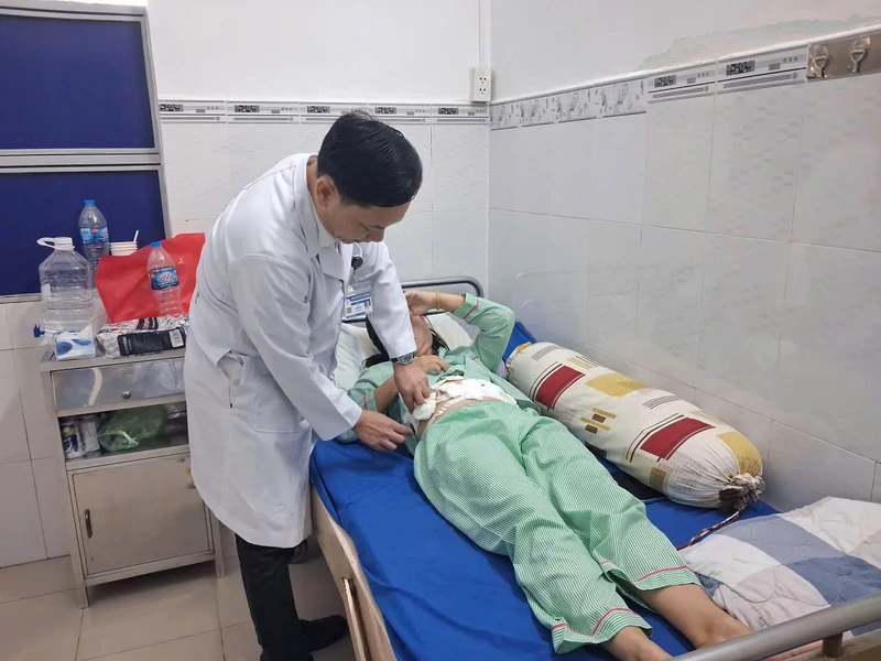 Bác sĩ CKI Lê Ngọc Nam, thành viên kíp phẫu thuật kiểm tra tình hình hồi phục của người bệnh trước khi xuất viện.