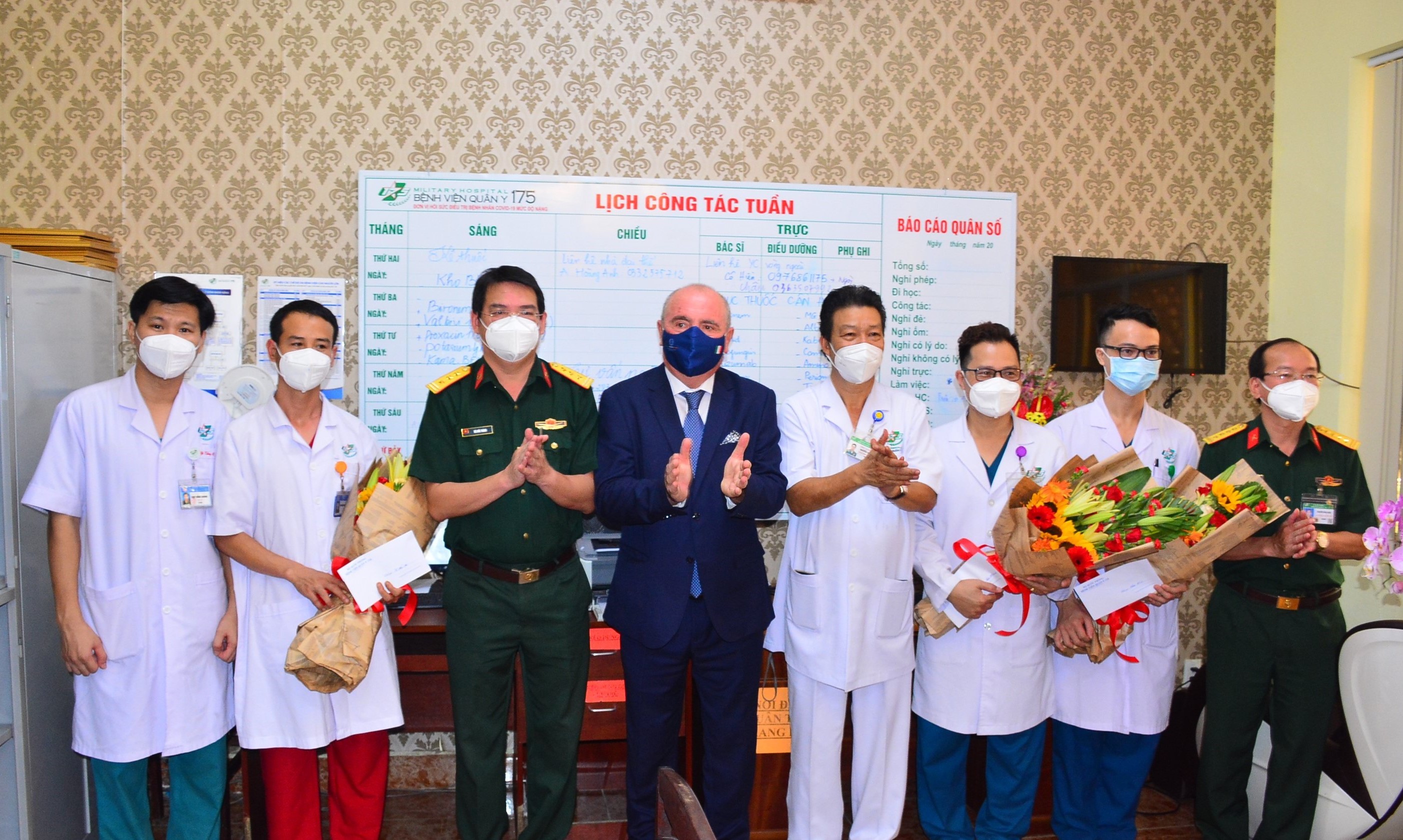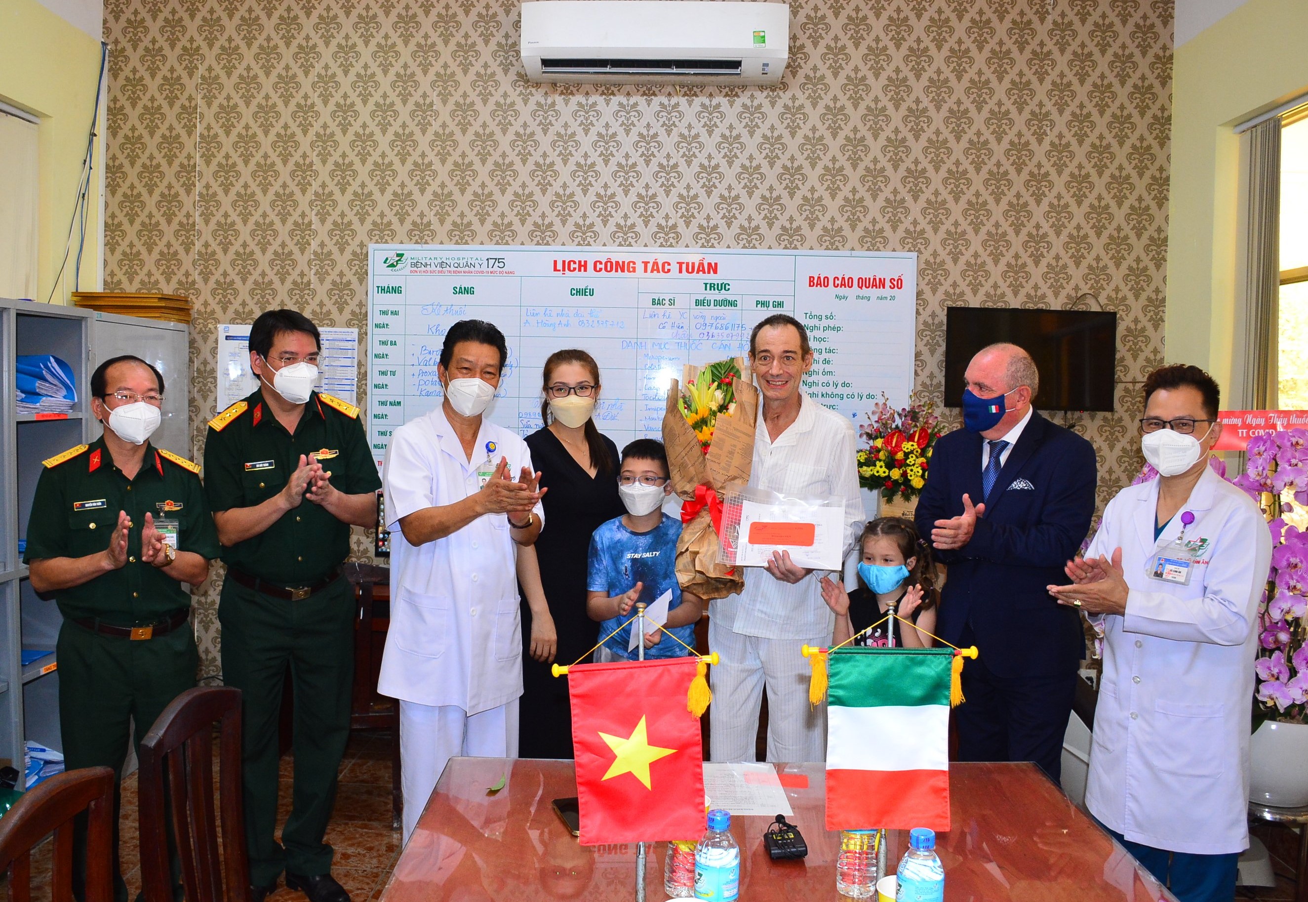 Tại buổi trao giấy ra viện, ông Claudio Vivilecchia, Trưởng phòng Lãnh sự Italia gửi lời cảm ơn đến Ban Giám đốc, các y, bác sĩ Bệnh viện Quân y 175 tận tình chăm sóc, điều trị cho công dân Italia khỏi bệnh Covid-19. Ông Claudio Vivilecchia thể hiện sự cảm động khi trong quá trình điều trị, bệnh viện thường xuyên trao đổi, cung cấp thông tin kịp thời về tình hình bệnh nhân cho cơ quan ngoại giao Italia tại TP Hồ Chí Minh cũng như gia đình. Ông Claudio Vivilecchia chúc bệnh viện đạt nhiều thành tựu chuyên môn trong chăm sóc sức khỏe cho người dân Việt Nam, công dân nước ngoài.