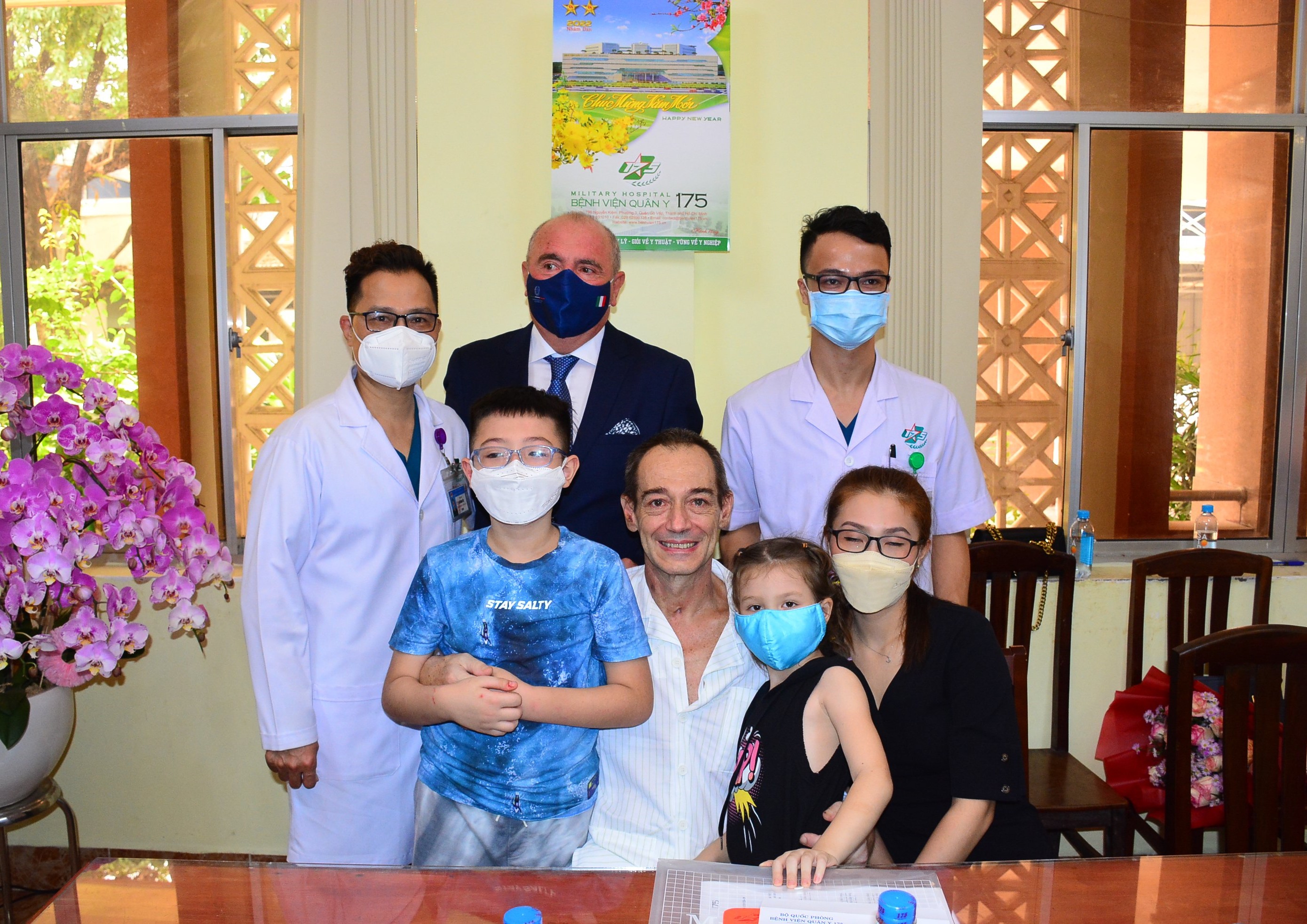 Lãnh đạo Bệnh viện Quân y 175 trao giấy ra viện cho bệnh nhân Luca.
