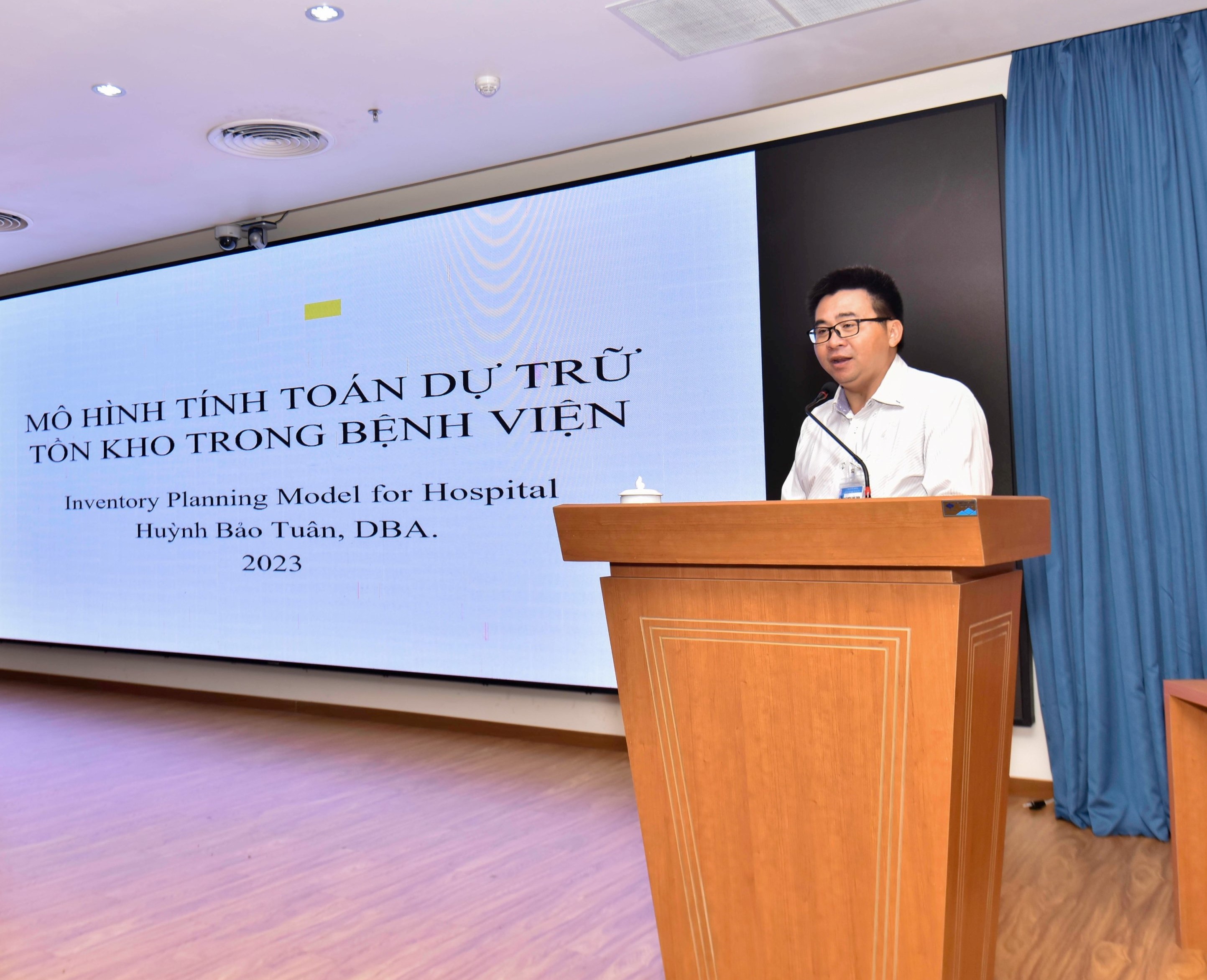 Cũng liên quan đến quản lý tồn kho, ThS Huỳnh Bảo Tuân, chuyên gia quản lý chất lượng bệnh viện, Đại học Bách khoa TPHCM đã cung cấp đến các đại biểu về mô hình tính toán dự trữ tồn khoa trong bệnh viện. Đó là tận dụng tính kinh tế nhờ quy mô trong sử dụng và vận chuyển, khắc phục sự không chắc chắn về nhu cầu và bổ̉ sung, cung cấp sự đáp ứng nhanh với bệnh nhân và là hàng rào ngăn chặn lạm phát và tăng giá.