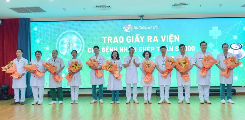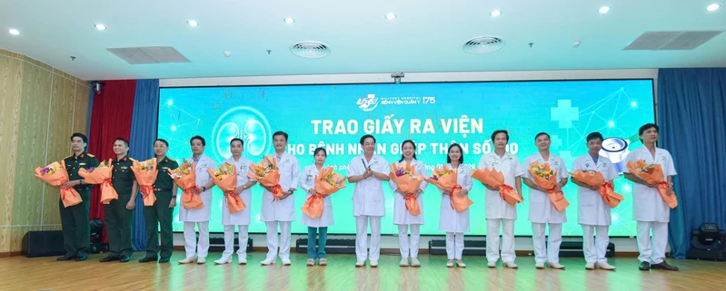 Đại tá, Tiến sĩ Nguyễn Việt Cường, Phó Giám đốc Bệnh viện Quân y 175 trao giấy ra viện, chúc mừng bệnh nhân ca ghép thận số 100.