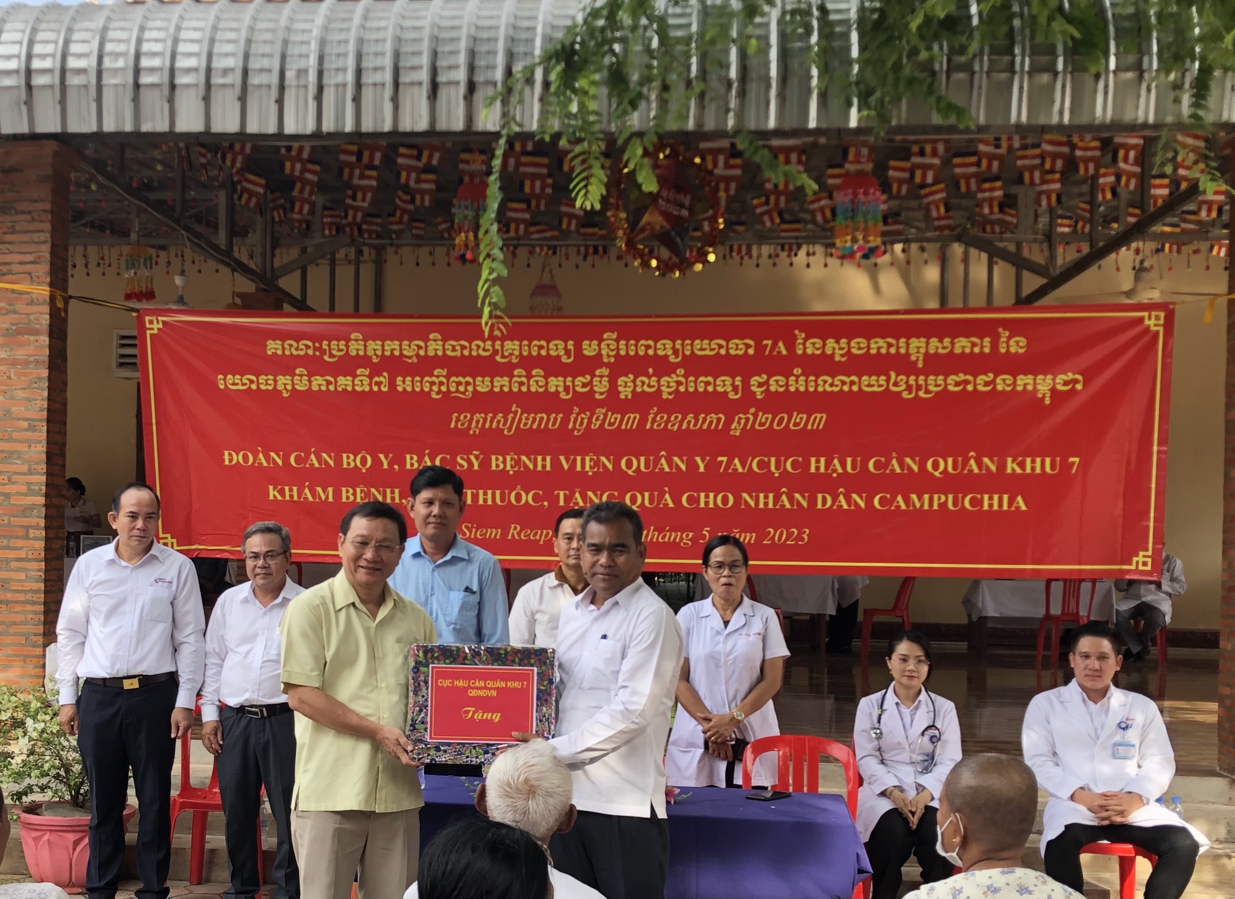 (QK7 Online) - Ngày 23/5/2023, đoàn công tác số 1 Cục Hậu cần do Bệnh viện Quân y 7A phụ trách đến khám bệnh, cấp thuốc, tặng quà tại huyện Prasat Bakong, tỉnh Siem Reap, thuộc địa bàn Bộ Tư lệnh Quân khu 4, Quân đội Hoàng gia Campuchia.