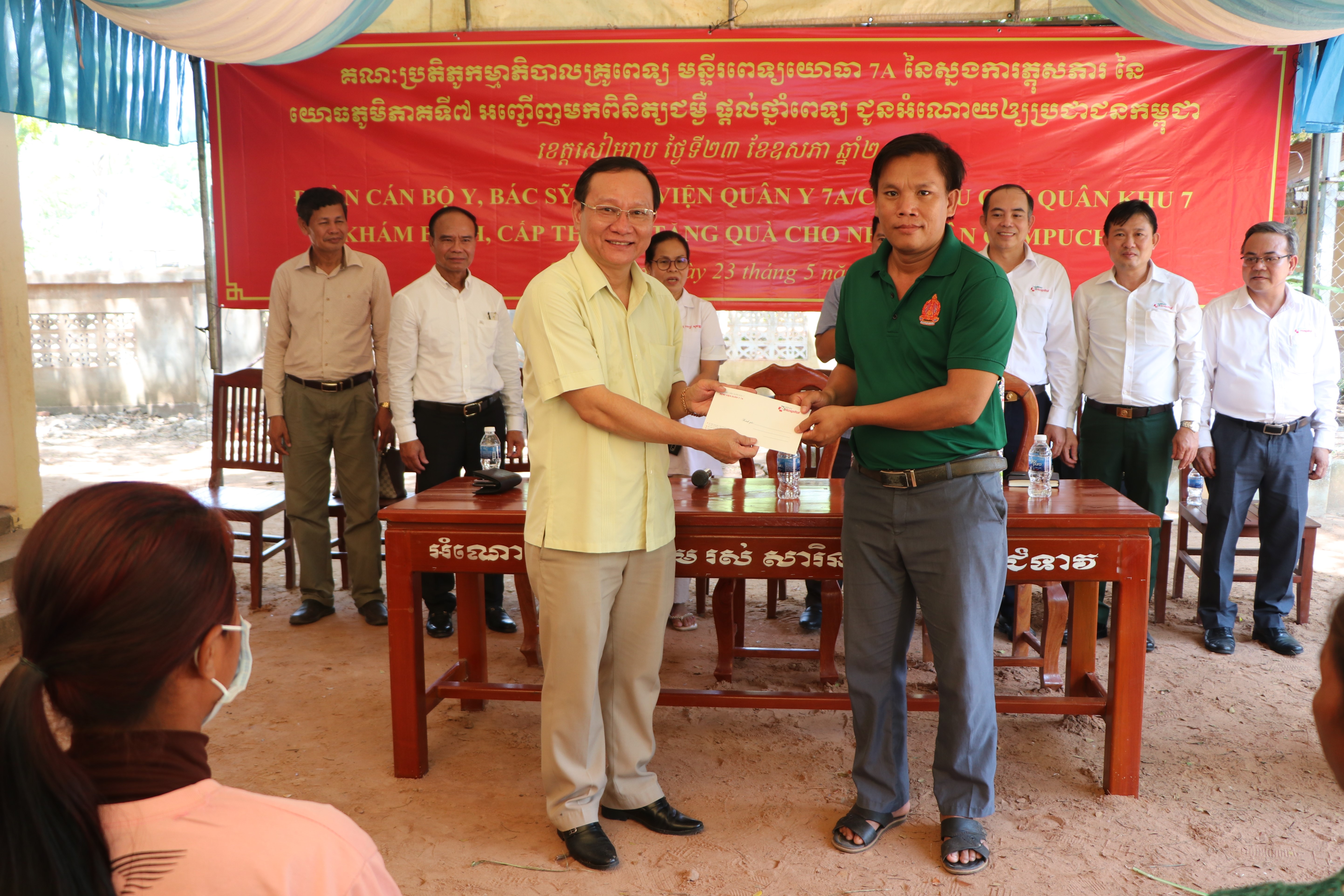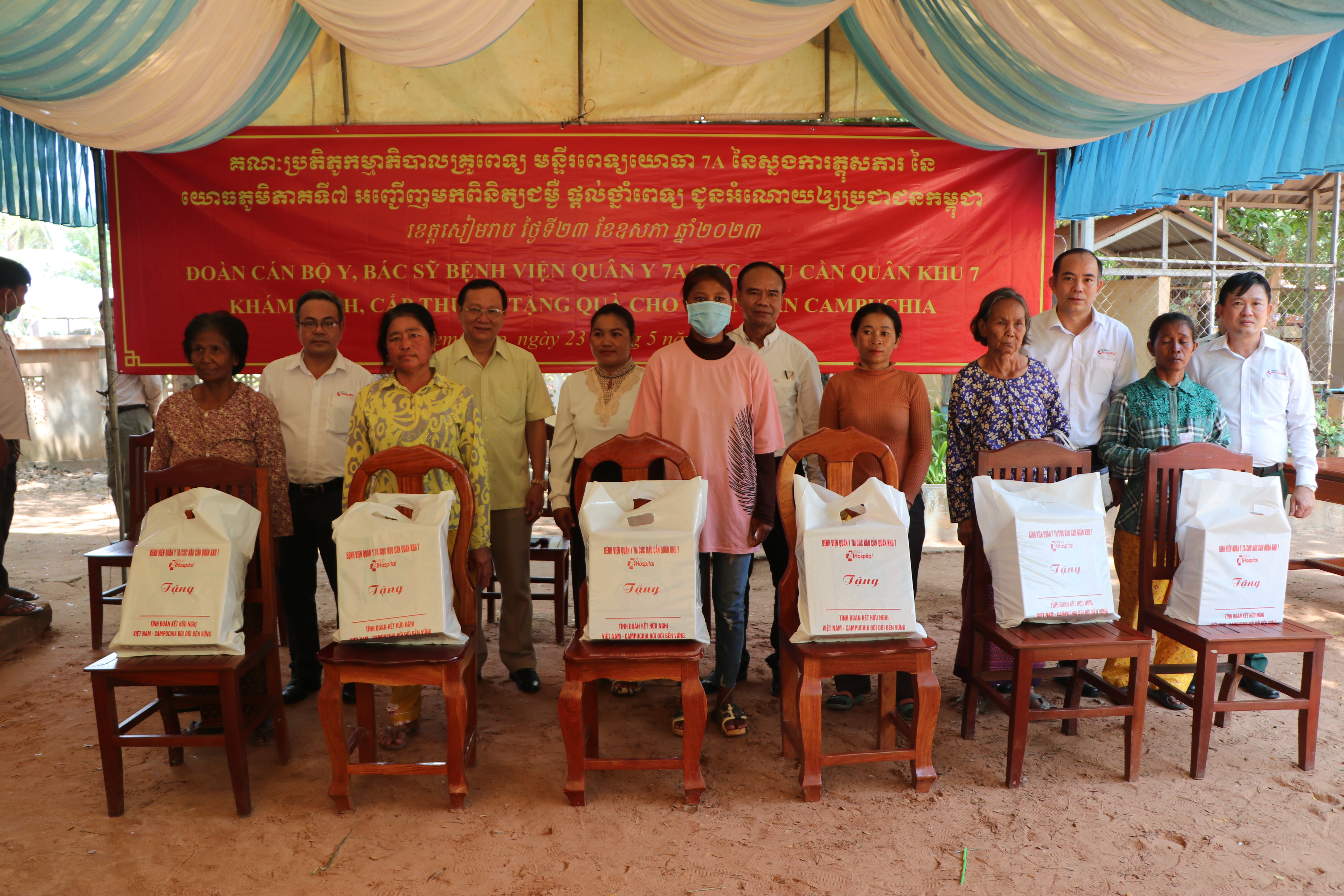 Mỗi người dân sau khi được cấp thuốc còn nhận thêm một phần quà gồm các nhu yếu phẩm, tổng trị giá thuốc và quà là 500 ngàn đồng/phần. Trung tướng Nith Narong, Phó Tham mưu trưởng Quân khu 4, Quân đội Hoàng gia Campuchia có mặt trong suốt chuyến đi cùng đoàn nhằm kịp thời hỗ trợ cũng như gửi lời cám ơn đội ngũ bác sĩ của Bệnh viện Quân y 7A, Quân khu 7 đã đến với người dân Campuchia.