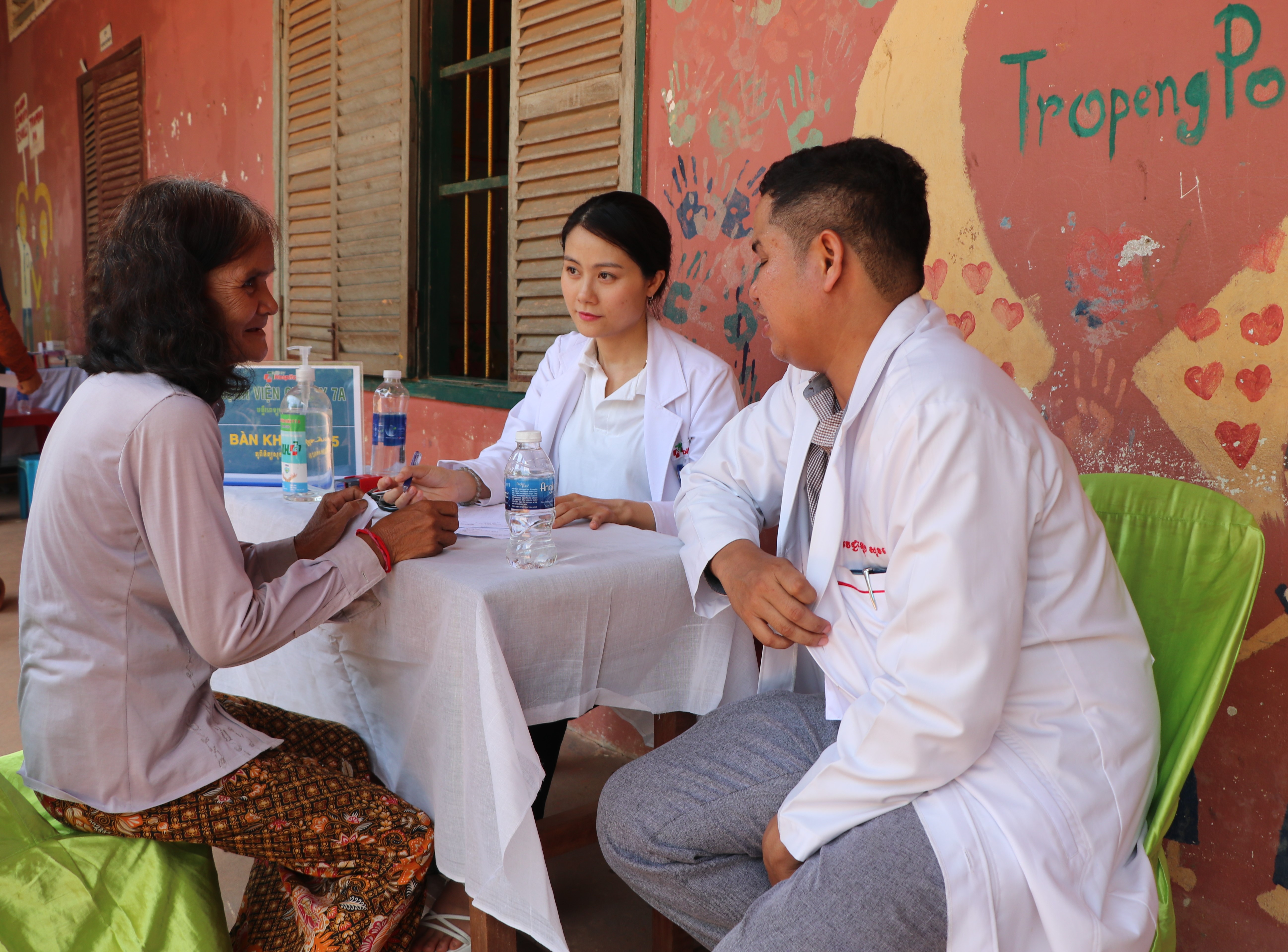 Điểm khám đầu tiên vào sáng ngày 23/5 đặt tại khuôn viên rộng mát, yên bình của chùa Kok Chan, xã Ampil với 5 bàn khám, 1 bàn cấp thuốc. Hơn 200 người dân địa phương là lao động nghèo, người cao tuổi đã được các bác sĩ bệnh viện 7A tận tình thăm khám, tư vấn sức khoẻ tổng quát.