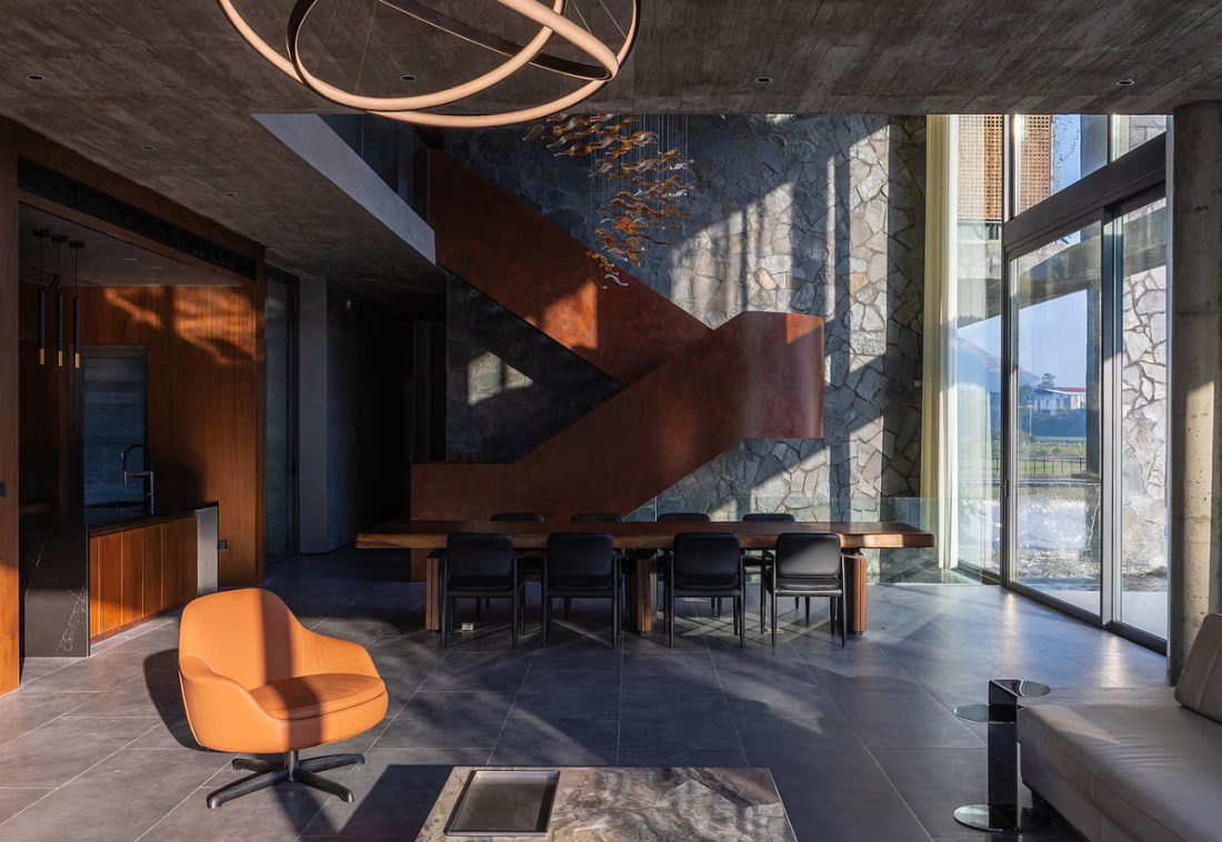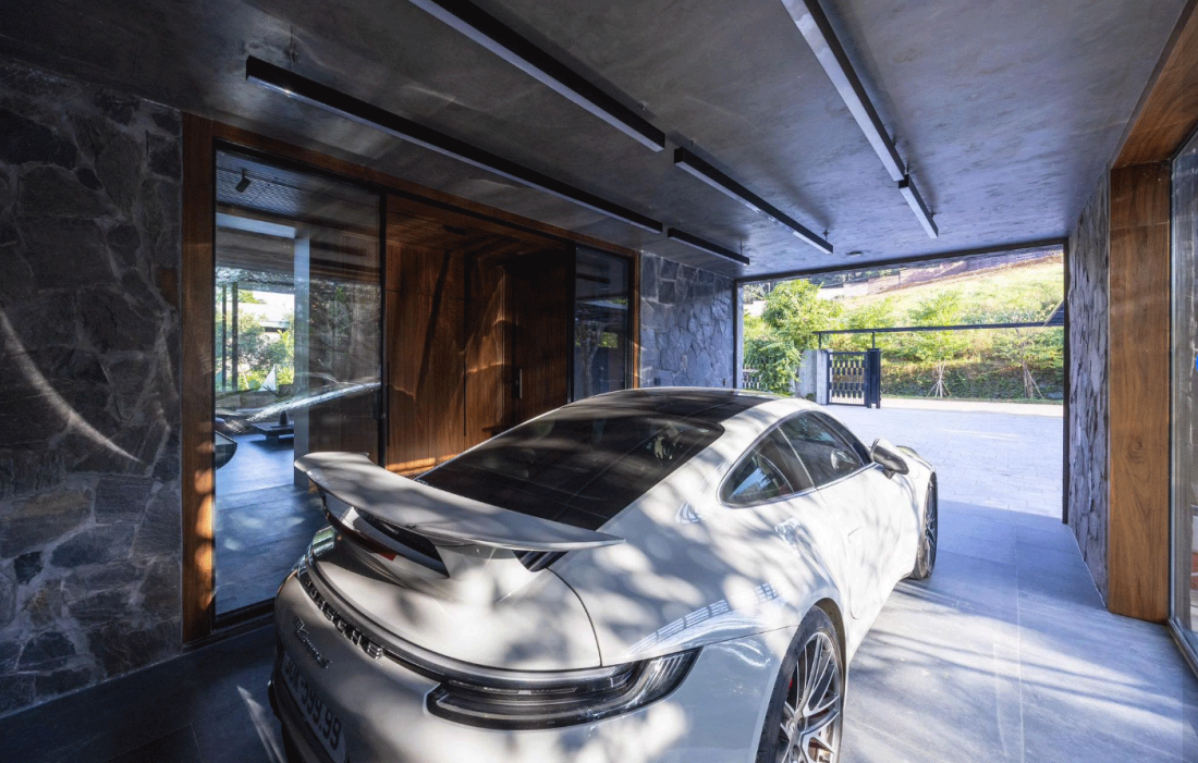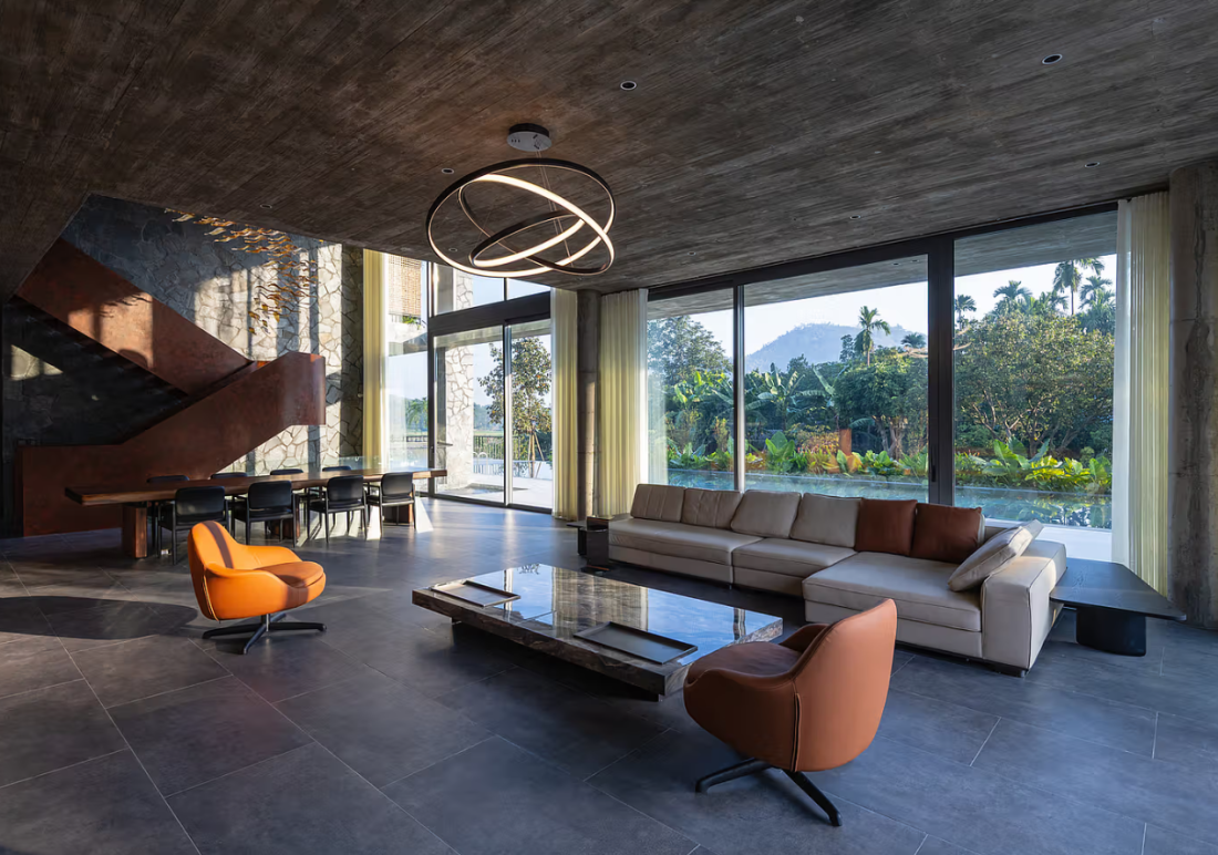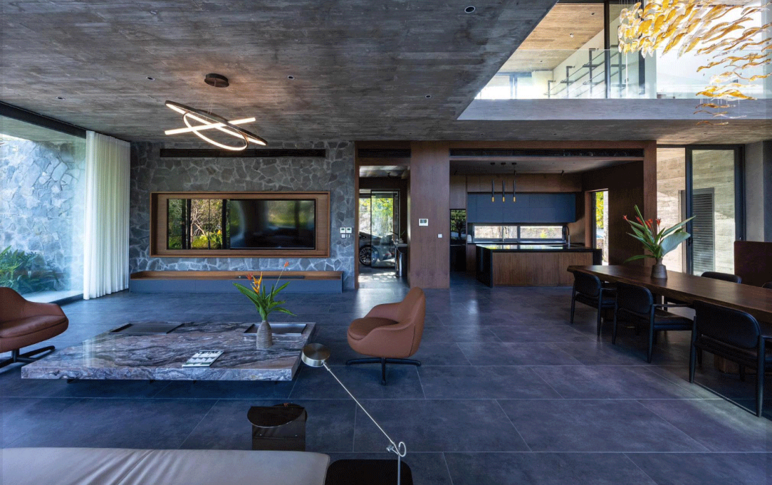 Không gian tầng trệt được thiết kế mở, liên hoàn và tiện nghi. Nội thất ngôi nhà được định hình bởi những mảng trần bê tông trần phẳng phiu, đối thoại cùng các bức tường đá tự nhiên thô ráp.
