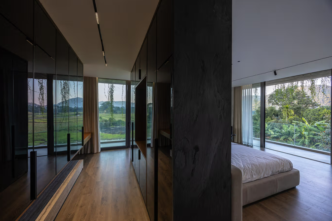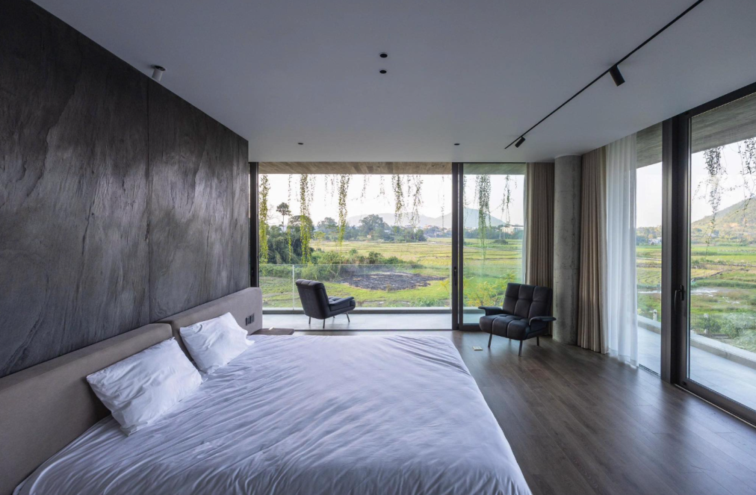 Cảm hứng thực tế: Việc sử dụng đá tự nhiên để phân chia các khu vực chức năng không chỉ mang lại sự vững chãi mà còn tạo ra chiều sâu thị giác. Tại tầng trệt, các tông màu sẫm của đá và bê tông tạo nên sự ổn định, bám rễ vào lòng đất. Ngược lại, tầng hai với các phòng ngủ hướng thẳng ra cánh đồng lại ưu tiên sự thanh thoát, tận dụng ánh sáng tự nhiên để sưởi ấm tâm hồn mỗi sớm mai.