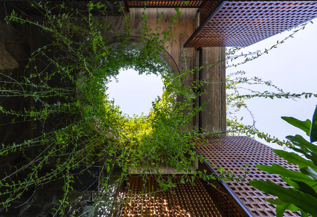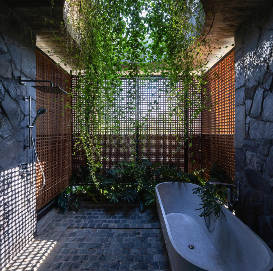 Phòng tắm thay vì che giấu hoàn toàn, thiết kế chọn cách trang trí sử dụng tường gạch lỗ kết hợp đá, Ánh nắng chiếu xuống khoảng hổ trên trần và dây leo tạo nên cảm xúc thị giác rất riêng.