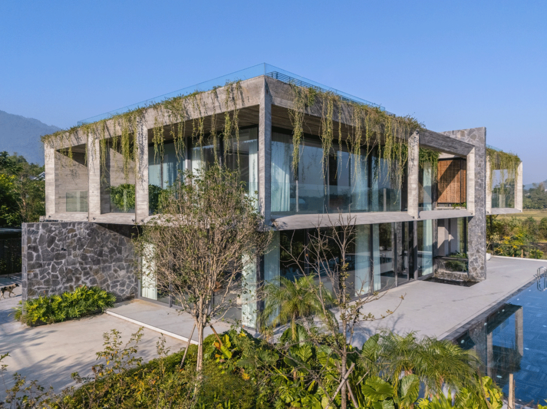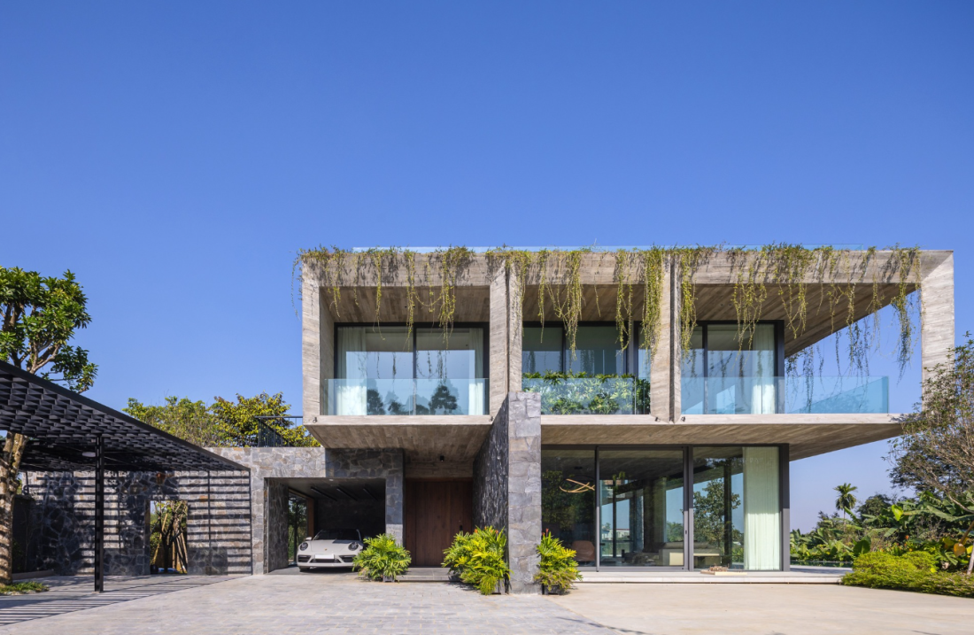 Rời xa nhịp sống hối hả của nội đô Hà Nội, tại vùng ngoại ô Quốc Oai với những cánh đồng trải dài và đồi thấp nhấp nhô, một khối lập phương bằng bê tông trần hiện lên như một điểm dừng chân của sự tĩnh tại. Biệt thự hiện lên không cố gắng lấn át thiên nhiên bằng những chi tiết trang trí cầu kỳ mà chọn hòa mình vào cảnh quan thông qua ngôn ngữ hình học tối giản và vật liệu thô mộc.