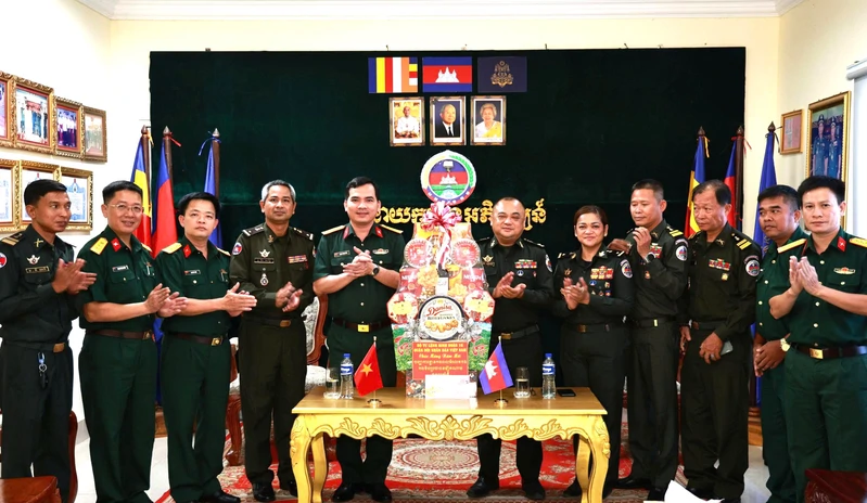 Đại tá Trịnh Phạm Hòa, Bí thư Đảng ủy, Phó Tư lệnh Binh đoàn 16, chúc Tết cán bộ, chiến sĩ Cục Phát triển, Bộ Quốc phòng Vương quốc Campuchia.