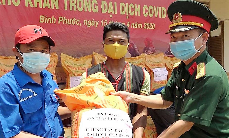 (QK7 Online) - Nhằm kịp thời trợ cấp người dân đang bị ảnh hưởng bởi đại dịch Covid-19, ngày 17/4, tại Trung đoàn 717, Binh đoàn 16 tổ chức trao 1.360 phần quà, mỗi phần từ 10-20kg gạo cho công nhân thuộc Binh đoàn và người dân hoàn cảnh khó khăn trên địa bàn huyện Bù Đốp, tỉnh Bình Phước.