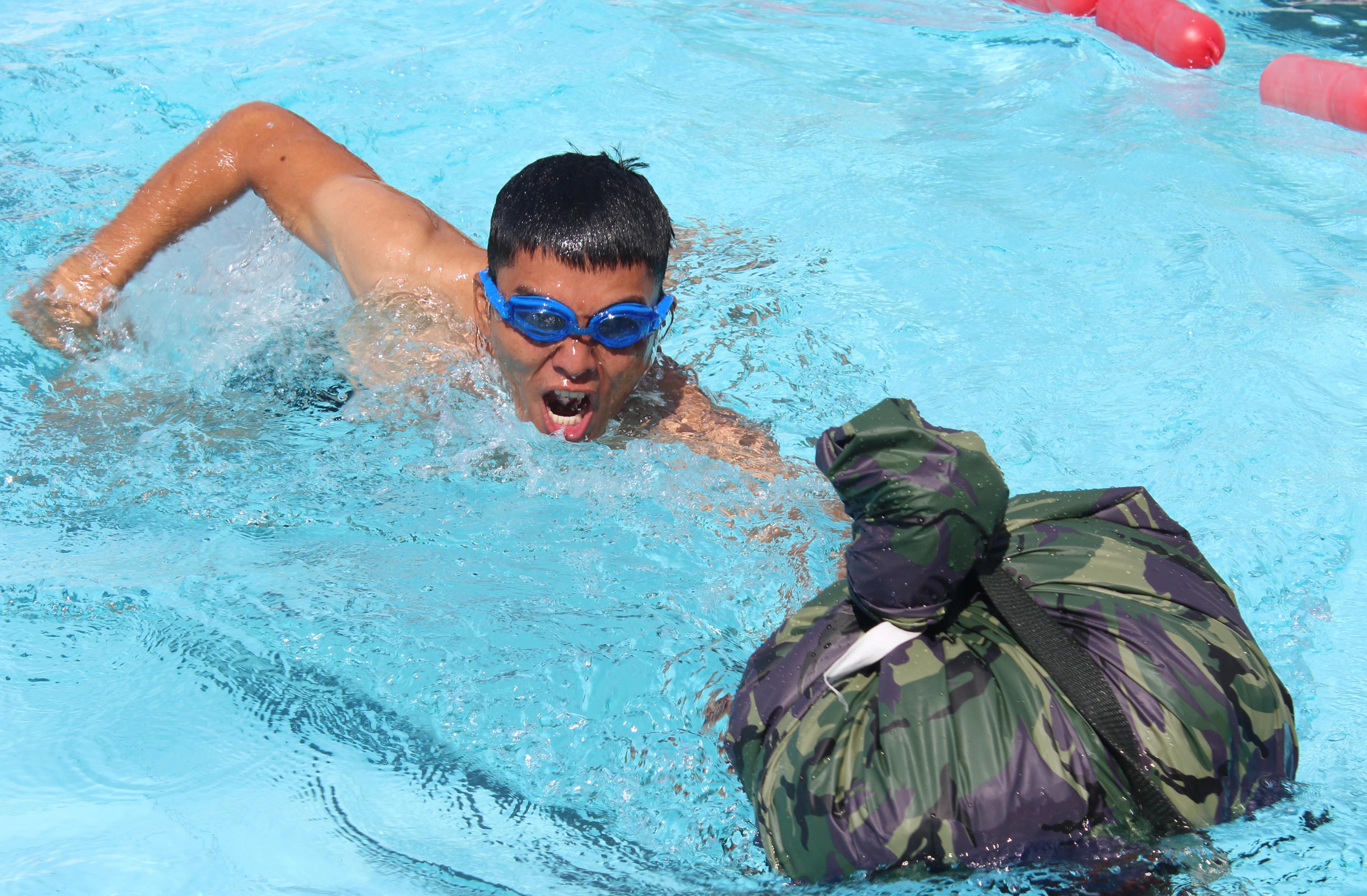 Ở nội dung bơi ứng dụng tiếp sức giữa 2 vận động viên trong đội, yêu cầu sự khéo léo của các vận động viên trong gói, buộc trang bị, kỹ thuật bơi và sức khỏe tốt để chiến thắng trên đường đua. Ở nội dung này, đoàn vận động viên huyện Phú Quý đã phát huy được sở trường, bứt phá về nhất; nhì là Đại đội Trinh sát 5 và giải ba thuộc về vận động viên Ban CHQS thành phố Phan Thiết. Trung úy Đỗ Biền, Trung đội trưởng pháo 105 mm huyện Phú Quý cho biết: Sở dỹ có thành tích vượt trội là nhờ luyện tập thường xuyên. Với nội dung bơi ứng dụng phải có thể lực, kỹ thuật, thao tác nhanh, chú trọng rèn luyện sức khỏe, nâng dần thành tích qua mỗi lần tập. Vì là nội dung bơi tiếp sức nên phối hợp nhịp nhàng với đồng đội.