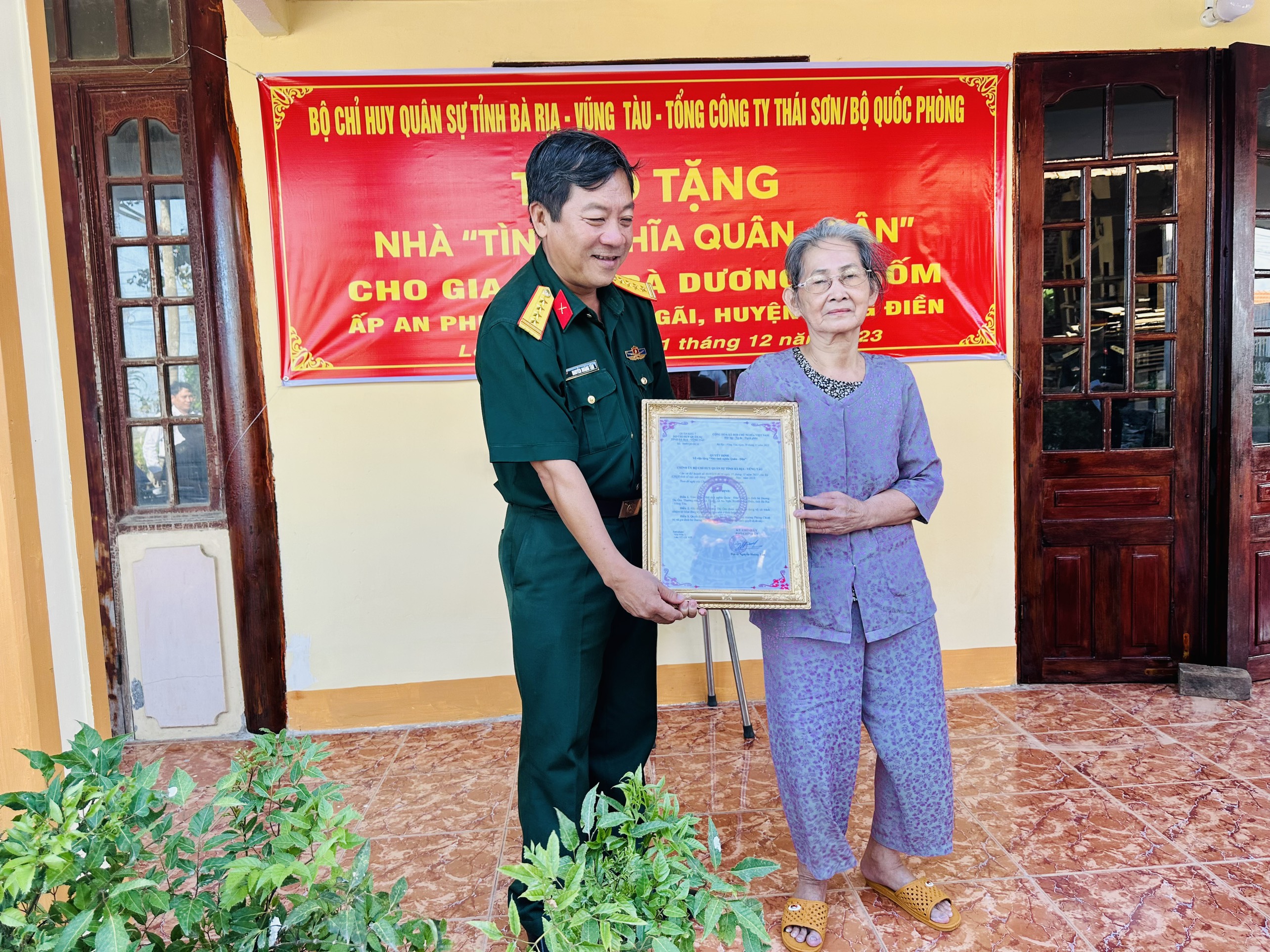 (QK7 Online) - Tại ấp An Phước, xã An Ngãi, huyện Long Điền, Bộ CHQS tỉnh Bà Rịa-Vũng Tàu phối hợp với Tổng Công ty Thái Sơn, Bộ Quốc phòng  bàn giao “Nhà tình nghĩa quân – dân” tặng gia đình bà Dương Thị Ốm, là cựu tù chính trị, đang thờ cúng liệt sĩ.