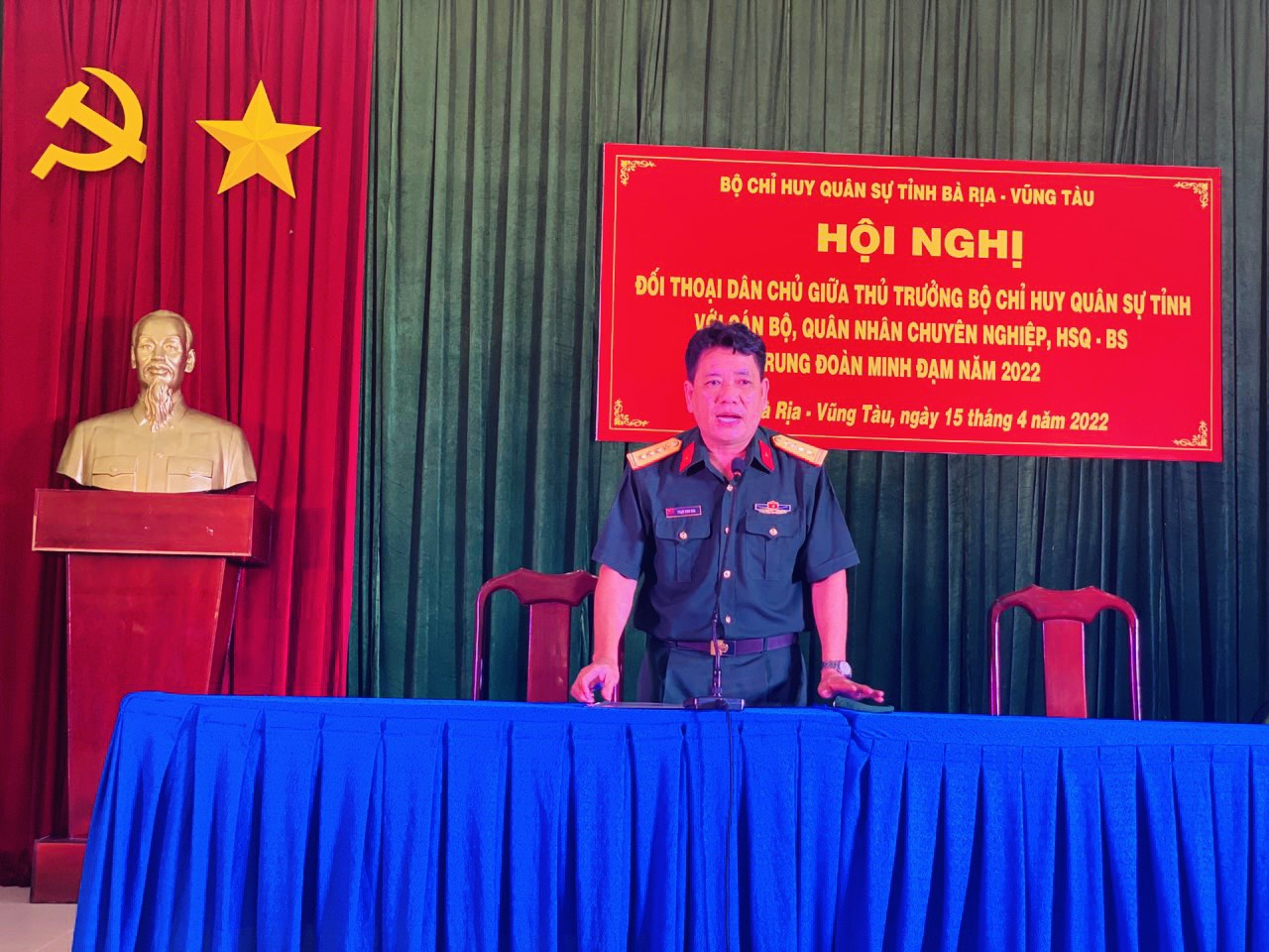 (QK7 Online) - Tối 15-4, Đại tá Phạm Kinh Kha, Phó Chỉ huy trưởng, Tham mưu trưởng Bộ Chỉ huy Quân sự (CHQS) tỉnh Bà Rịa-Vũng Tàu chủ trì hội nghị đối thoại dân chủ giữa thủ trưởng Bộ CHQS tỉnh với cán bộ, chiến sĩ Trung đoàn Minh Đạm.