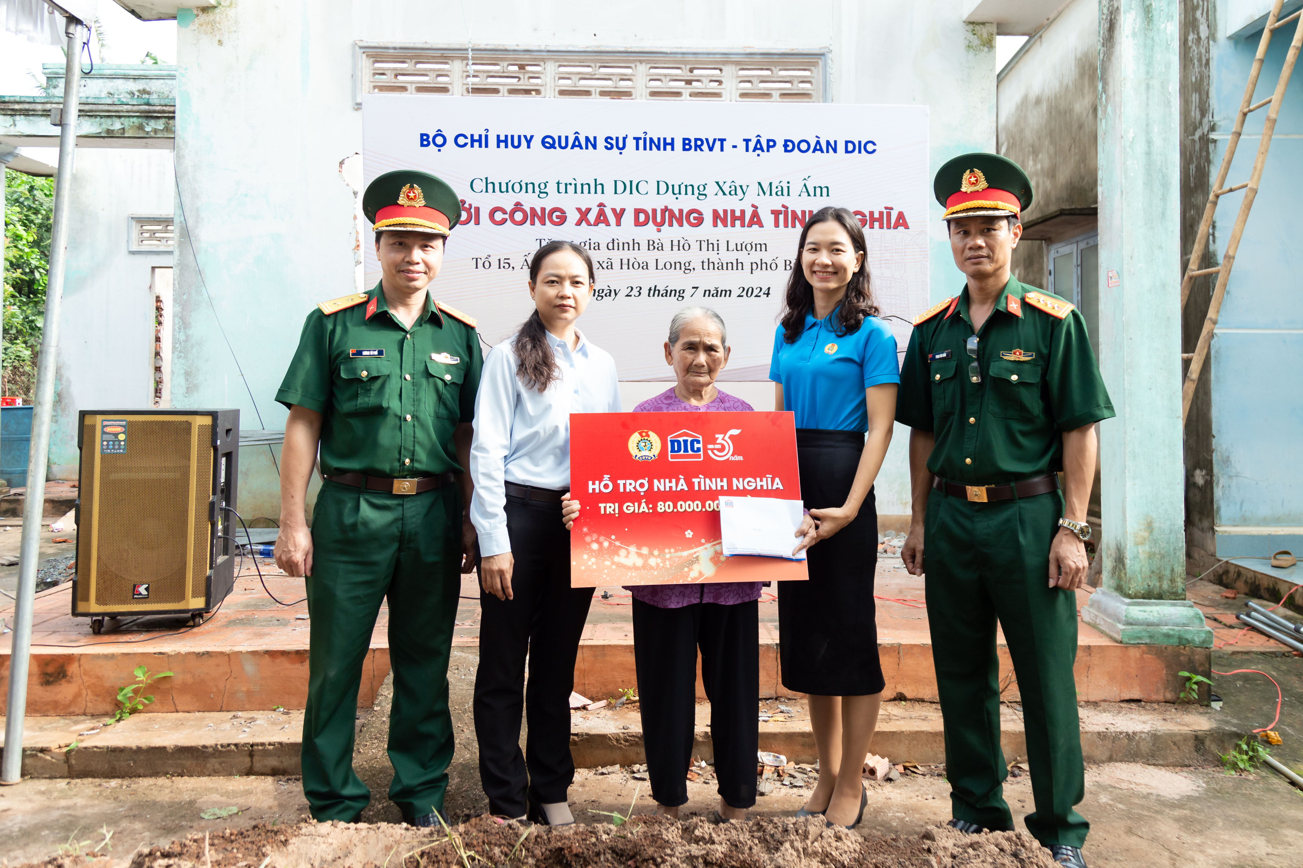 (QK7 Online) - Nhân kỷ niệm 77 năm Ngày Thương binh Liệt sĩ 27/7, chiều ngày 23/7, Bộ CHQS tỉnh Bà Rịa - Vũng Tàu phối hợp với Tập đoàn DIC tổ chức khởi công xây dựng “Nhà tình nghĩa” tặng gia đình bà Hồ Thị Lượm là cựu tù chính trị Côn Đảo và là vợ liệt sĩ, trú tại tổ 15, ấp Đông, xã Hòa Long, thành phố Bà Rịa.