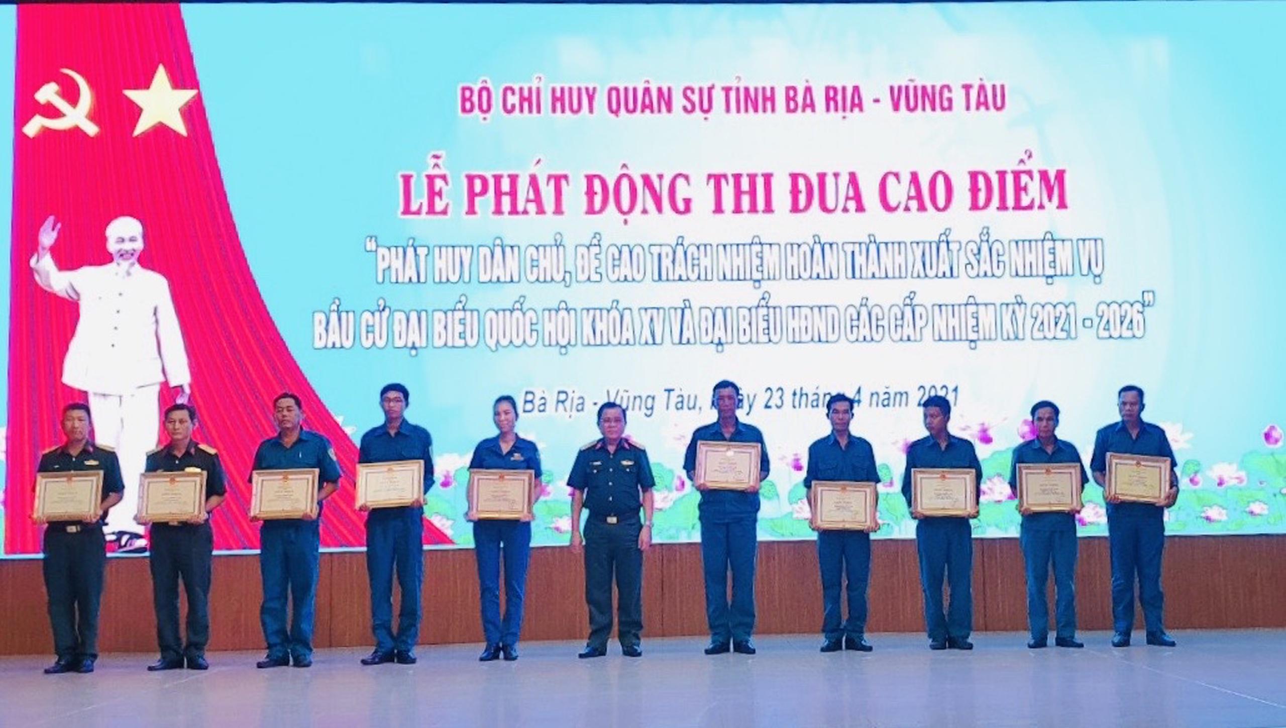 (QK7 Online) -Ngày 23/4, Đảng ủy, Bộ CHQS tỉnh Bà Rịa-Vũng Tàu tổ chức Lễ phát động thi đua cao điểm “Phát huy dân chủ, đề cao trách nhiệm, hoàn thành xuất sắc nhiệm vụ bầu cử Đại biểu Quốc hội (ĐBQH) khóa XV và bầu cử đại biểu HĐND các cấp, nhiệm kỳ 2021-2026”.