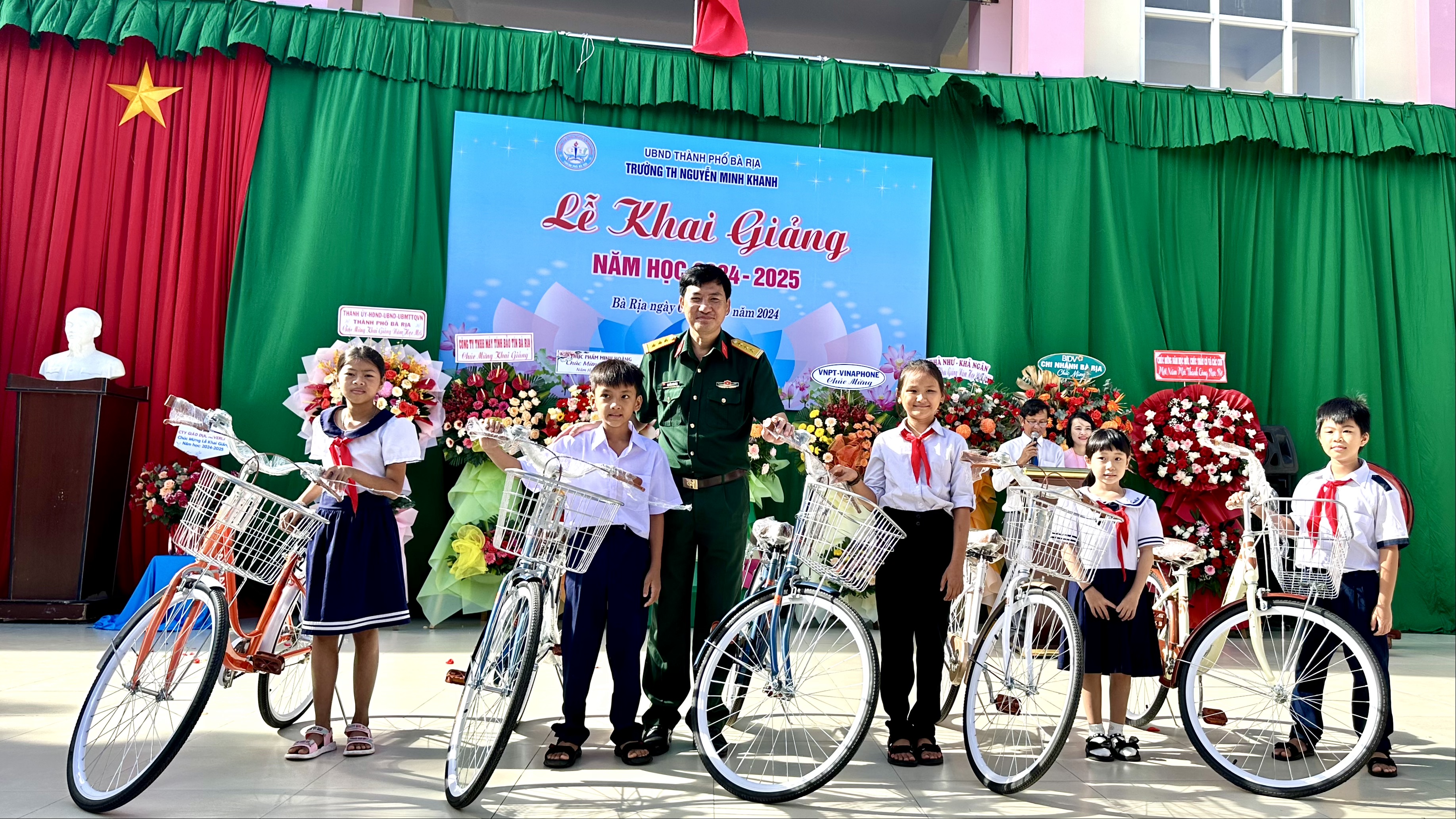 Thượng tá Nguyễn Xuân Công, Phó Chủ nhiệm Chính trị Bộ CHQS tỉnh trao tặng xe đạp cho các em học sinh có hoàn cảnh khó khăn.