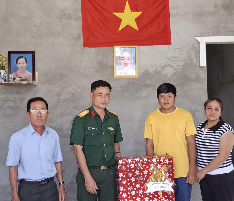 Ban CHQS thị xã Kiến Tường tặng quà cho gia đình ông Nguyễn Duy Khánh.