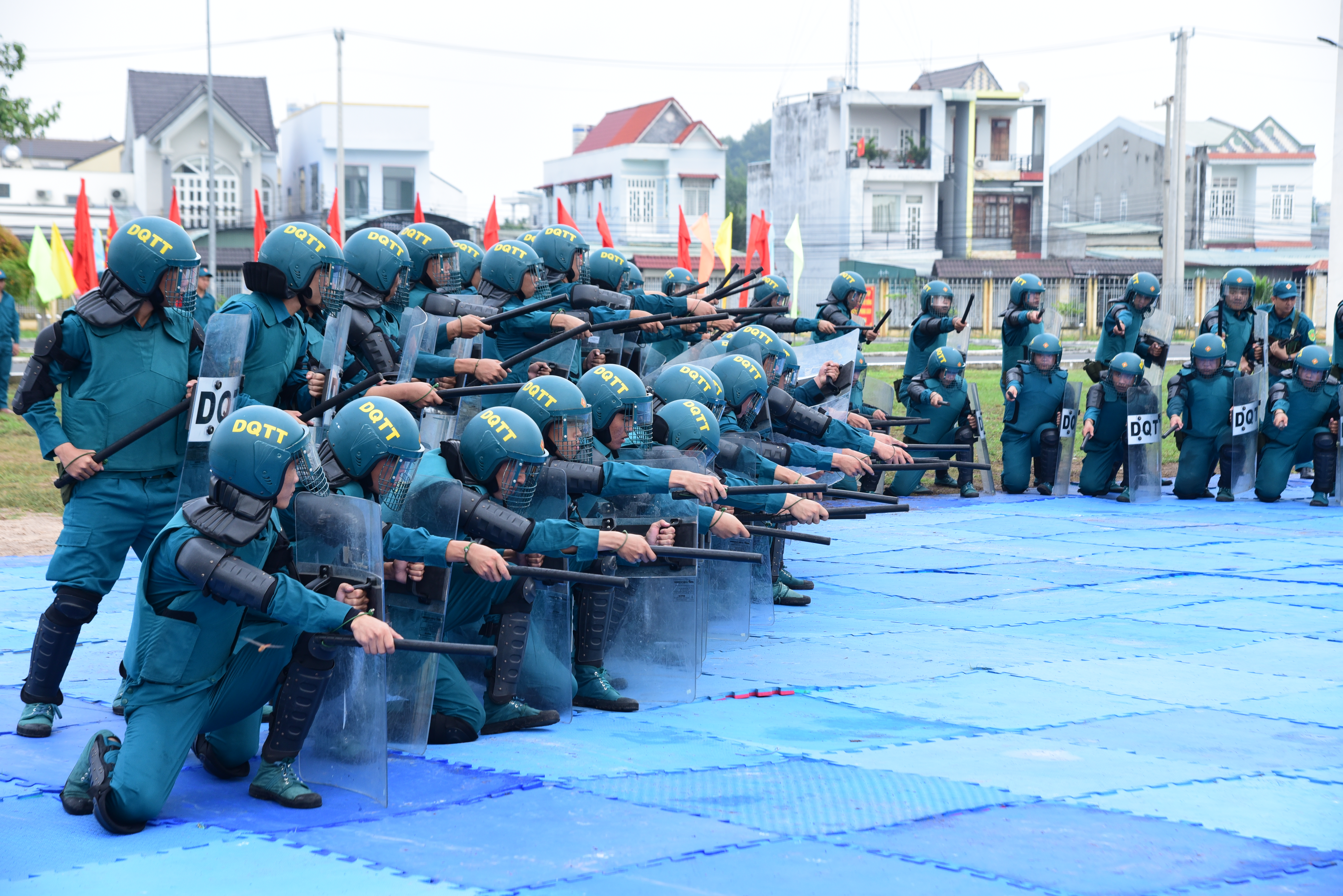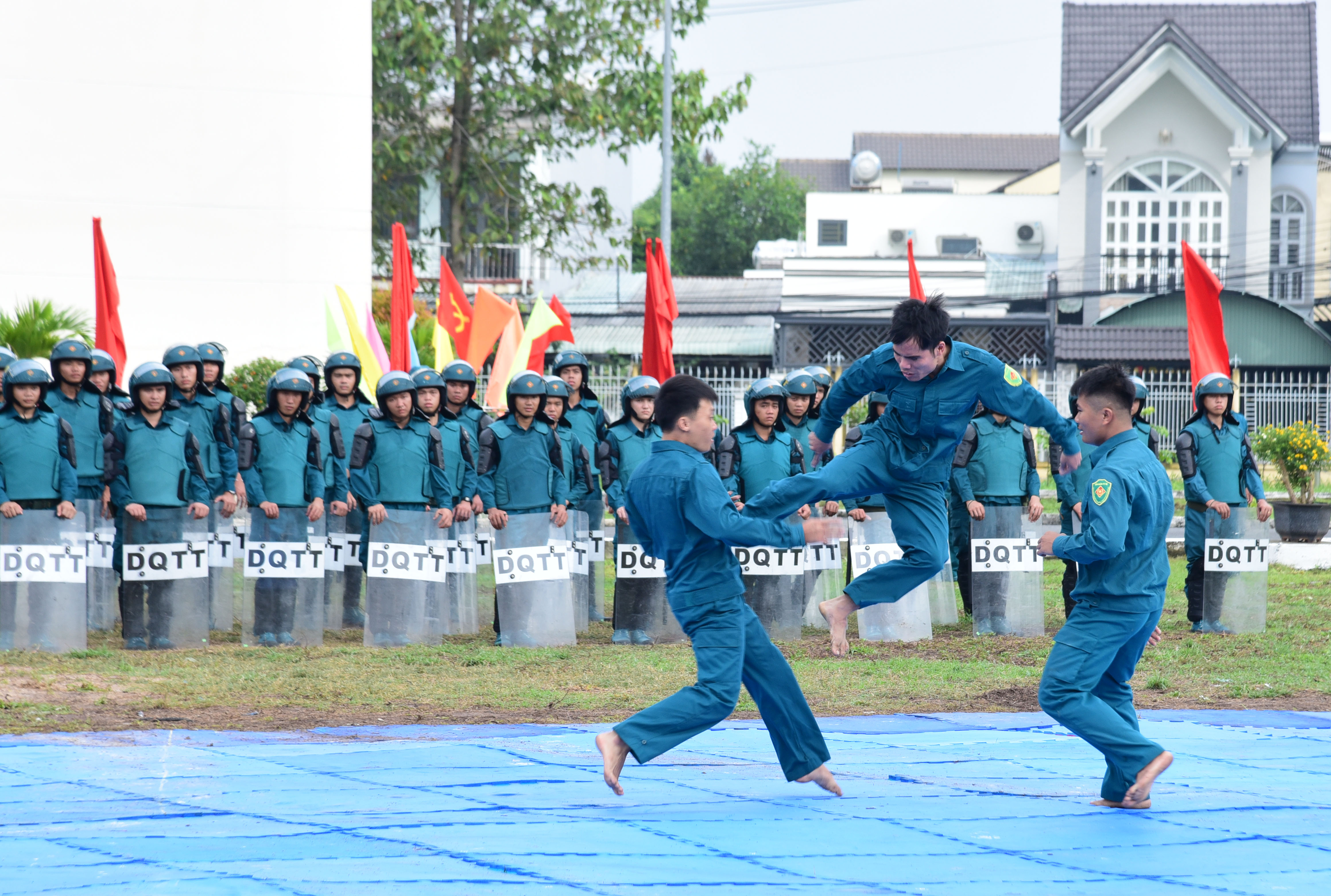 Trình diễn Đội hình lá chắn A2 của Đại đội dân quân thường trực Bộ CHQS tỉnh Bình Dương.