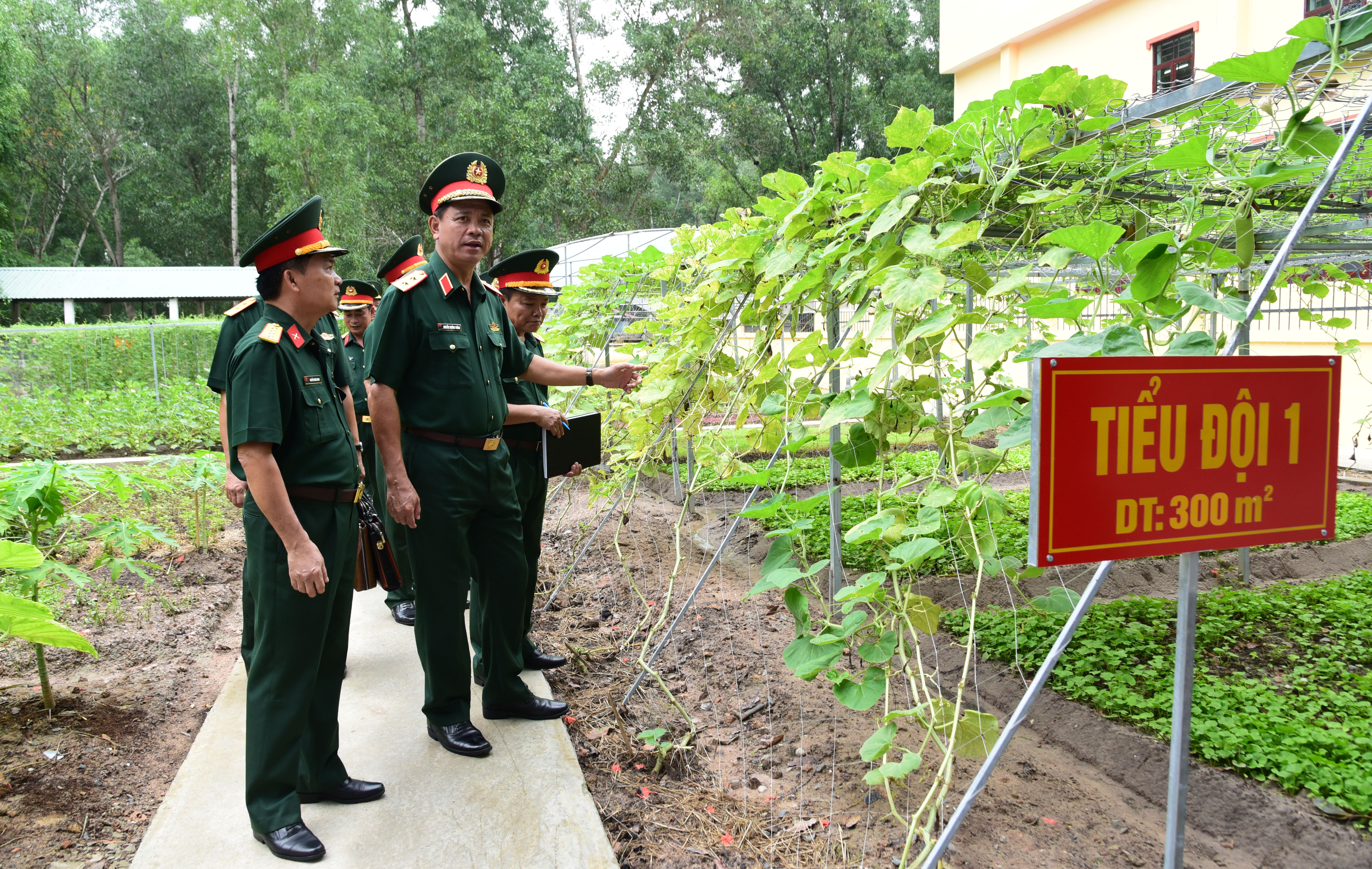 Trung tướng Nguyễn Trường Thắng , Ủy viên Trung ương Đảng, Tư lệnh Quân khu kiểm tra khu tăng gia sản xuất của Trung đội dân quân thường trực khu công nghiệp Mỹ Phước.