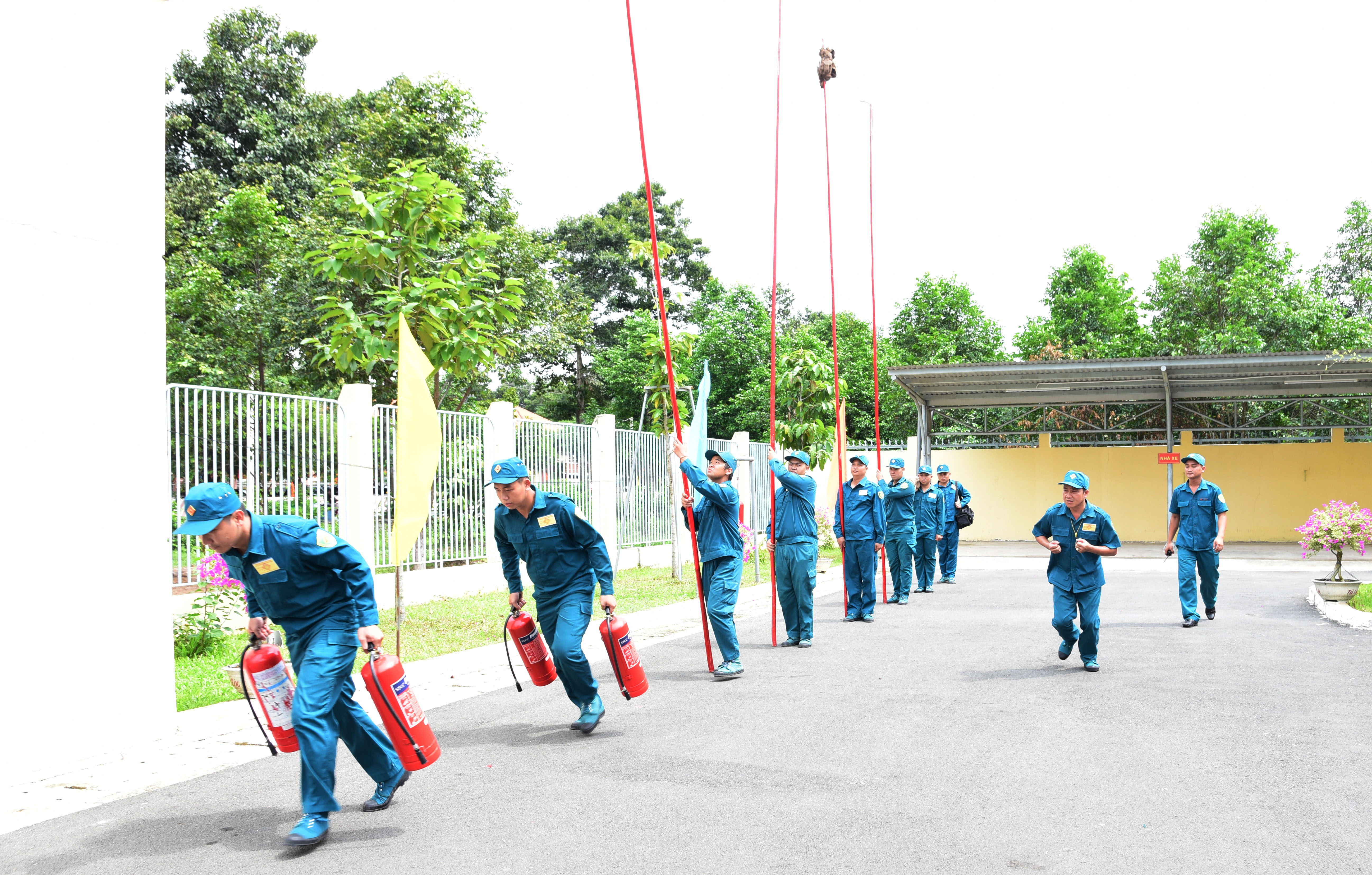 Trung đội dân quân thường trực khu công nghiệp Mỹ Phước phối hợp công an, lực lượng bảo vệ chuyên trách của khu công nghiệp cơ động giải quyết tình huống về an ninh trật tự trong khu công nghiệp.