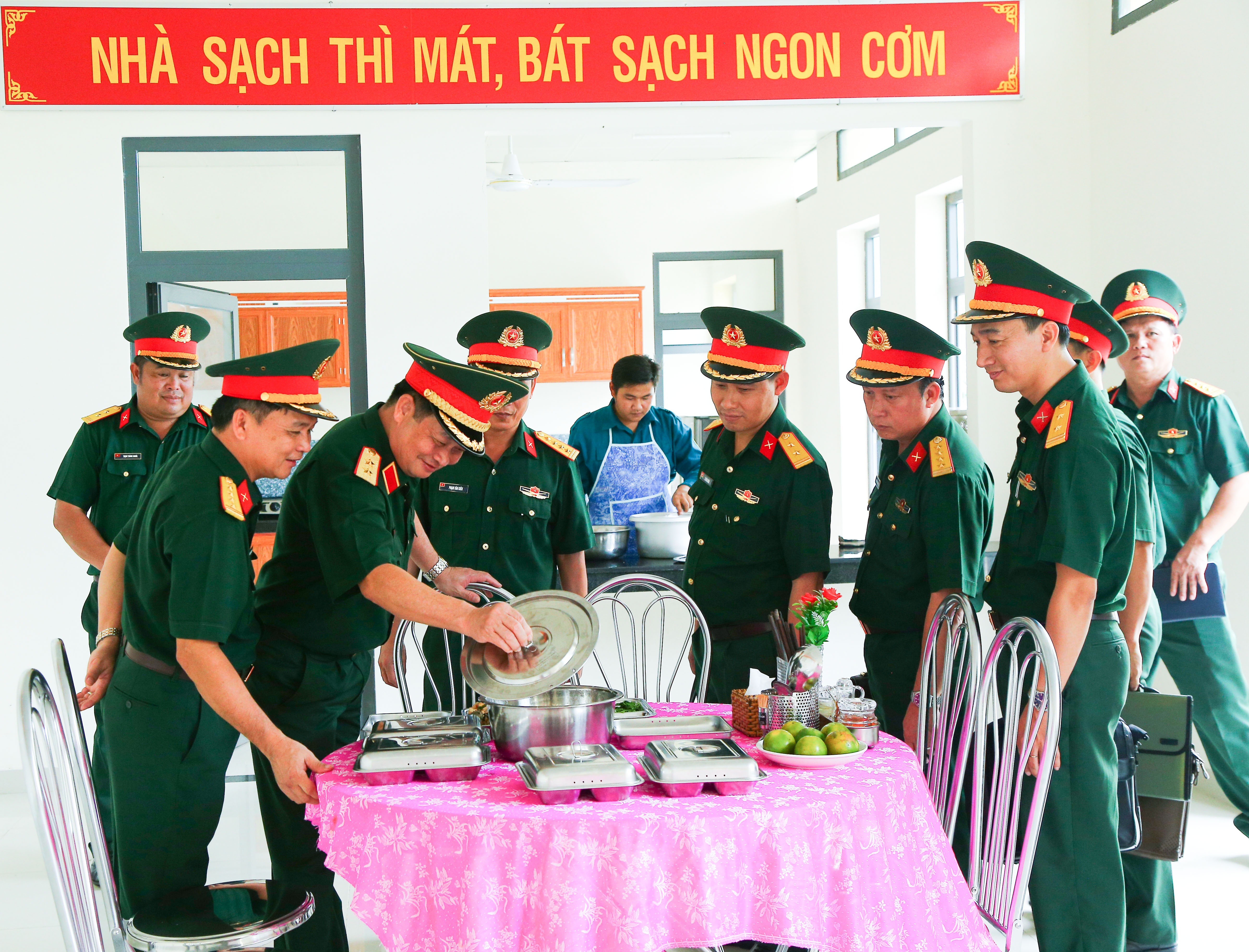 Trung tướng Trần Hoài Trung, Bí thư Đảng ủy, Chính ủy Quân khu kiểm tra nhà ăn của Ban CHQS xã Thanh An. Ảnh: Nguyễn Hoàng