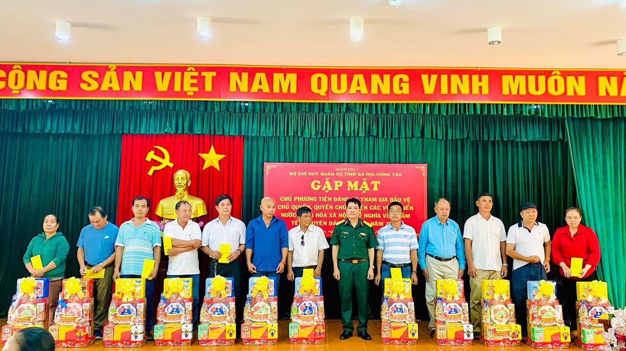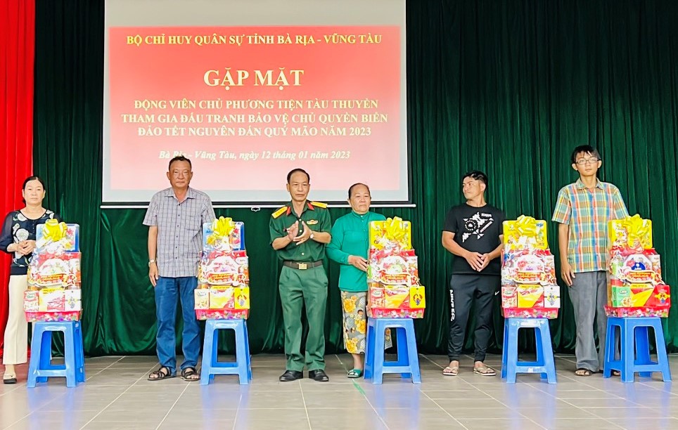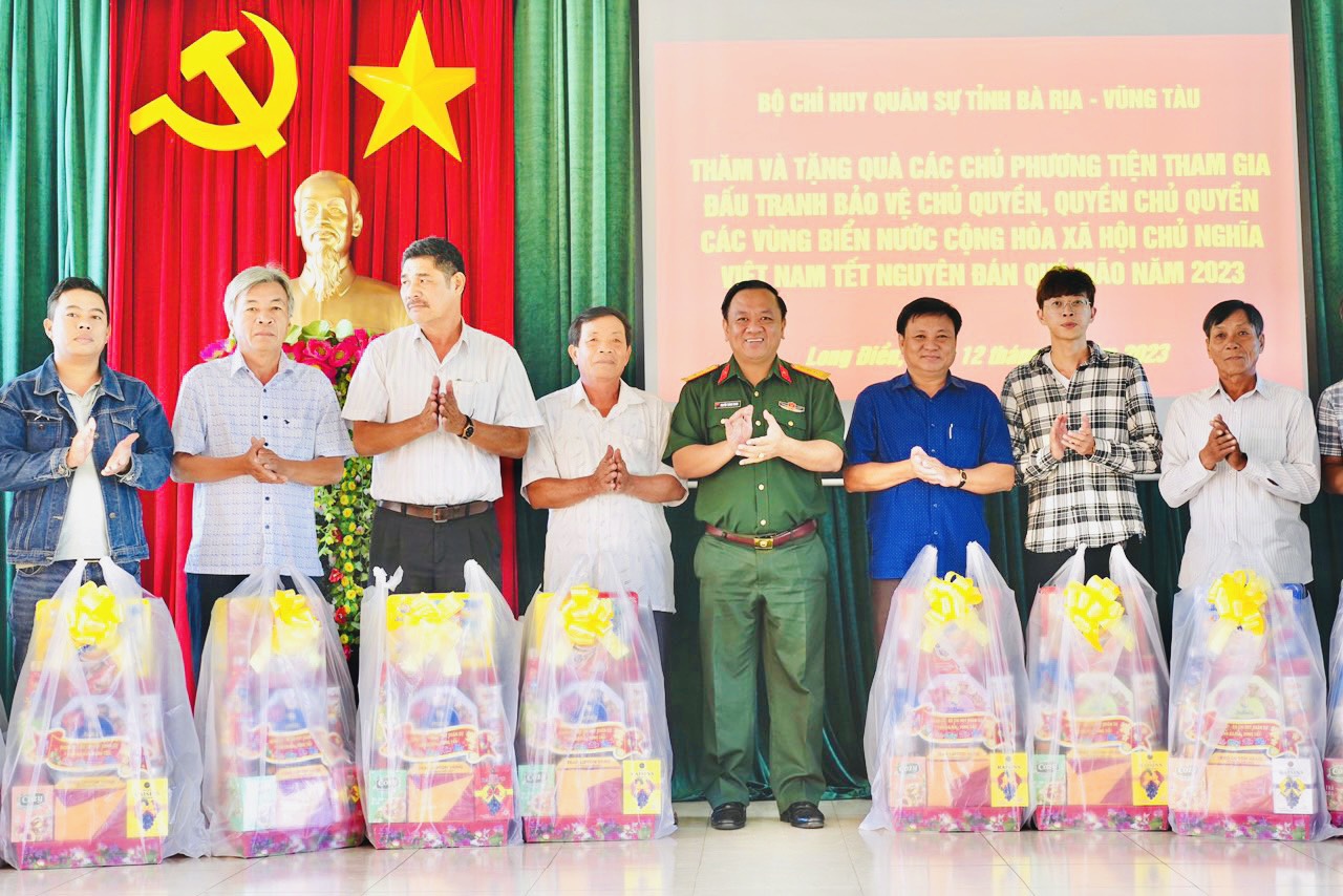 Đại tá Trần Văn Sơn, Phó Chỉ huy trưởng Bộ CHQS tỉnh tặng quà các chủ phương tiện tàu, thuyền huyện Đất Đỏ.